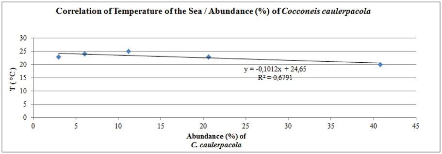 var. scutellum, which were initially the main fouling components occurring as patches, declined in July to be replaced by Cocconeis caulerpacola, the latter species being dominant in autumn (Fig. 3c). Due to the high RA of C. caulerpacola in September, the maximum abundance of taxa observed on C.taxifolia that month was replaced by the maximum abundance of taxa on Padina sp. The maximum RA of C .caulerpacola of over 40% was observed in October. No correlation between the abundance of C. caulerpacola and sea water temperature was confirmed (Fig. 4).