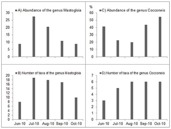 A) Abundance (%) of Mastogloia taxa on Caulerpa taxifolia fronds from June to October 2010. B) The number of Mastogloia taxa on Caulerpa taxifolia fronds. C) Abundance (%) of the genus Cocconeis on Caulerpa taxifolia fronds from June to October 2010. D) The number of Cocconeis taxa on Caulerpa taxifolia fronds