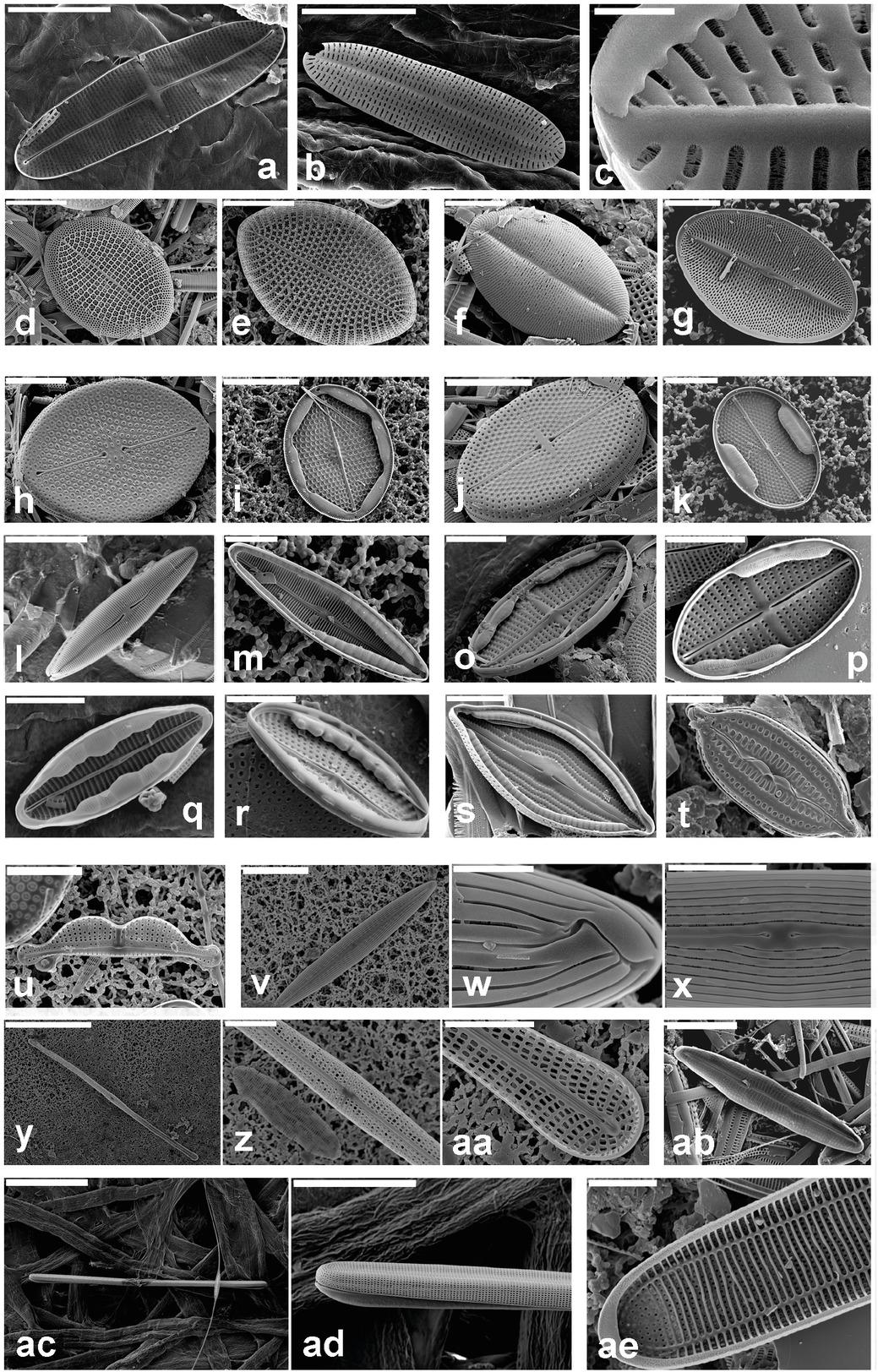 Scanning electron microscope (SEM) micrographs of epiphytic diatoms on the invasive Caulerpa taxifolia and autochthonous Halimeda tuna and Padina sp. macroalgae from the Adriatic Sea. Figs a–c. Cocconeis caulerpacola Witkowski, Car & Dobosz. Figs d, e. Cocconeis scutellum Ehrenberg var. scutellum, sternum valves. Fig. d. External view. Fig. e. Internal view. Figs f, g. Cocconeis molesta var. crucifera Grunow in Van Heurck, Sternum valves. Fig. f. External view; Fig. g. Internal view. Figs h, i. Mastogloia fimbriata (Brightwell) Cleve. Fig. h. External valve view. Fig. i. Internal valve view. Figs j, k. Mastogloia binotata (Grunow) Cleve. Fig. j. External valve view. Fig. k. Internal valve view. Figs l, m. Mastogloia cuneata (Meister) Simonsen. Fig. l. External valve view. Fig. m. Internal valve view. Fig. o. Mastogloia crucicula (Grunow) Cleve var. crucicula; internal view. Fig. p. Mastogloia crucicula var. alternans; internal view. Fig. q. Mastogloia pumila (Grunow) Cleve; internal view. Fig r. Mastogloia ovalis A. Schmidt; internal view. Fig. s. Mastogloia cyclops Voigt; internal valve view. Fig. t. Mastogloia corsicana Grunow in Cleve & Möller; external valve view. Fig. u. Amphora kolbei Aleem; internal view. Figs v, w, x. Navicula subagnita Proshkina-Lavrenko. Figs y, z, aa. Berkeleya scopulorum (Brébisson) Cox; internal views. Fig. ab Berkeleya rutilans (Trentepohl) Grunow; internal view. Figs ac, ad. Ardissonea fulgens (Greville) Grunow (SEM); external views. Fig. ae. Ardissonea crystallina (C.A. Agardh) Grunow; internal view. Scale bars = 100 μm (Fig. ac); 50 μm (Fig. y); 30 μm (Fig. ad); 20 μm (fig. i); 10 μm (Figs d, e, h, j, k, l, s, v); 5 μm (Figs a, b, f, g, m, o, p, q, r, t, u, z, ab, ae); 4 μm (Fig. aa); 3 μm (Fig. x); 1 μm (Fig. w); 500 nm (Fig. c)