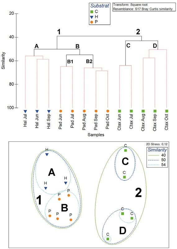 In addition to clusters 1 and 2, SIMPROF analysis also distinguished sub-clusters A, B, C, and D. Sub-cluster A contained diatom samples of H. tuna, sub-cluster B contained samples of Padina sp. Cluster 2 contained C. taxifolia samples from June and July (sub-cluster C) and samples from August, September and October (sub-cluster D). The highest similarity was observed between samples of Padina sp. from August, September and October.
