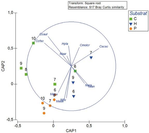 Canonical analysis of principal coordinates (CAP) was used to summarize the structure of diatom assemblages and to characterize epiphytic communities along the months and substrates.