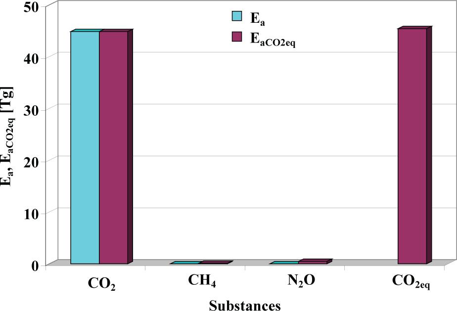It is clearly visible that carbon dioxide emission dominates among the greenhouse gases due to its intensifying effect of the greenhouse phenomenon, both in the case of the national annual emission from all categories of anthropogenic sources and that attributed discretely to road transport, notwithstanding the warming potential of CO2 being much smaller than that of methane and, especially, than that of nitrous oxide.