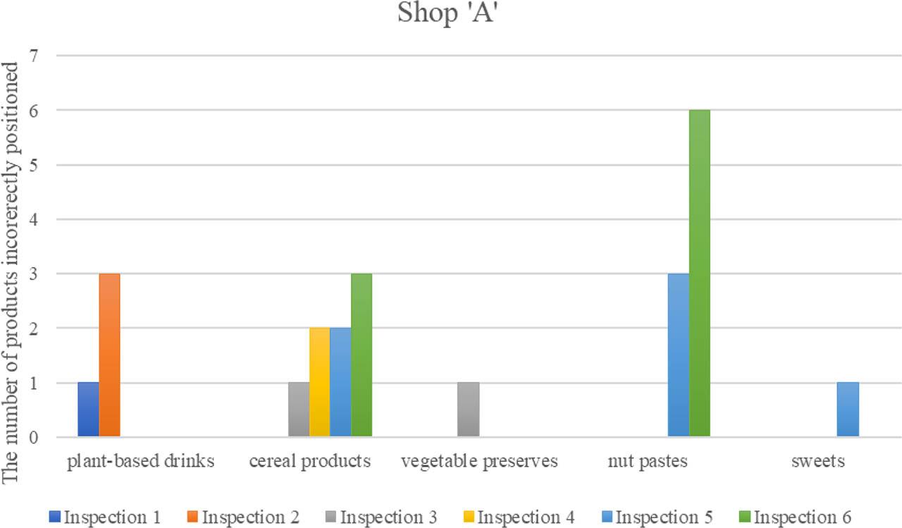 At store ‘B’, four inspections were conducted at four different locations. During each, irregularities in the functioning of the FIFO system were found. Depending on the location, the errors in the arrangement of products concerned articles of different categories. During the first inspection, irregularities in the functioning of the FIFO were found in: yoghurt, oat dessert, oat flakes and oat drinks. In the next location, the errors were recorded for plant-based drinks and olive oil. During the third inspection, errors were found in plant-based drinks, wheat flour and jam. However, in the fourth location, irregularities were for honey, jam and four types of juice.