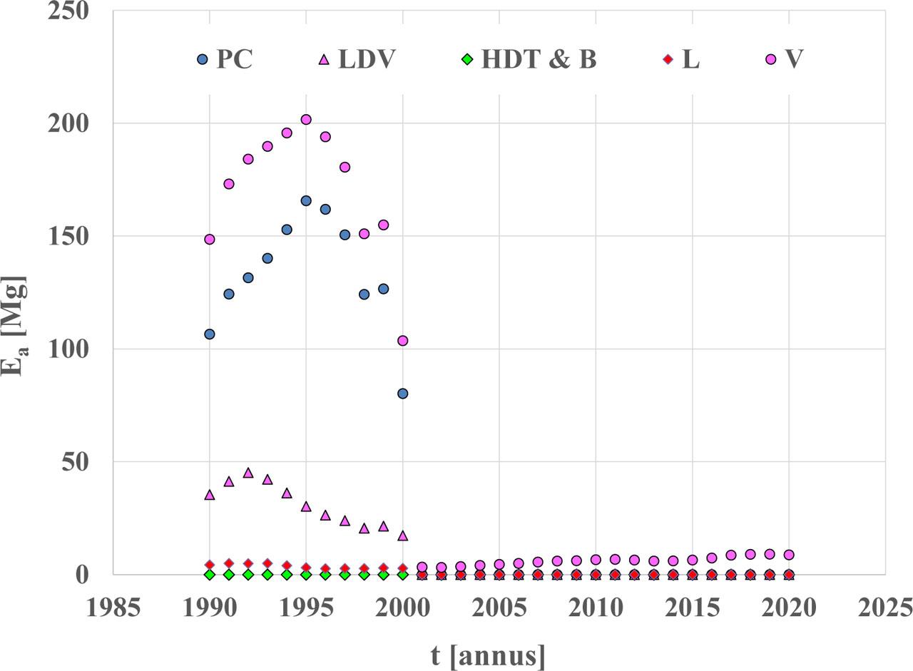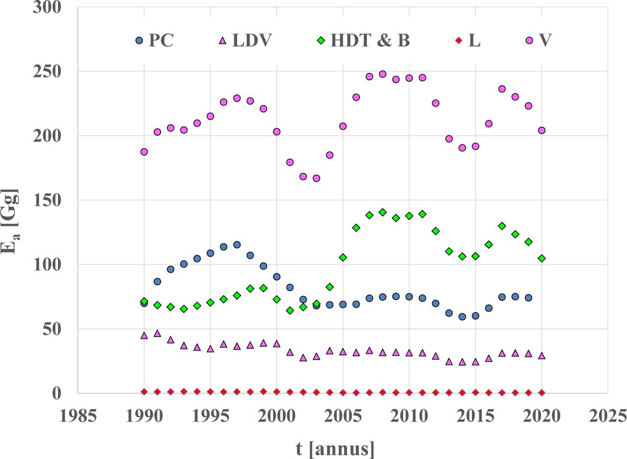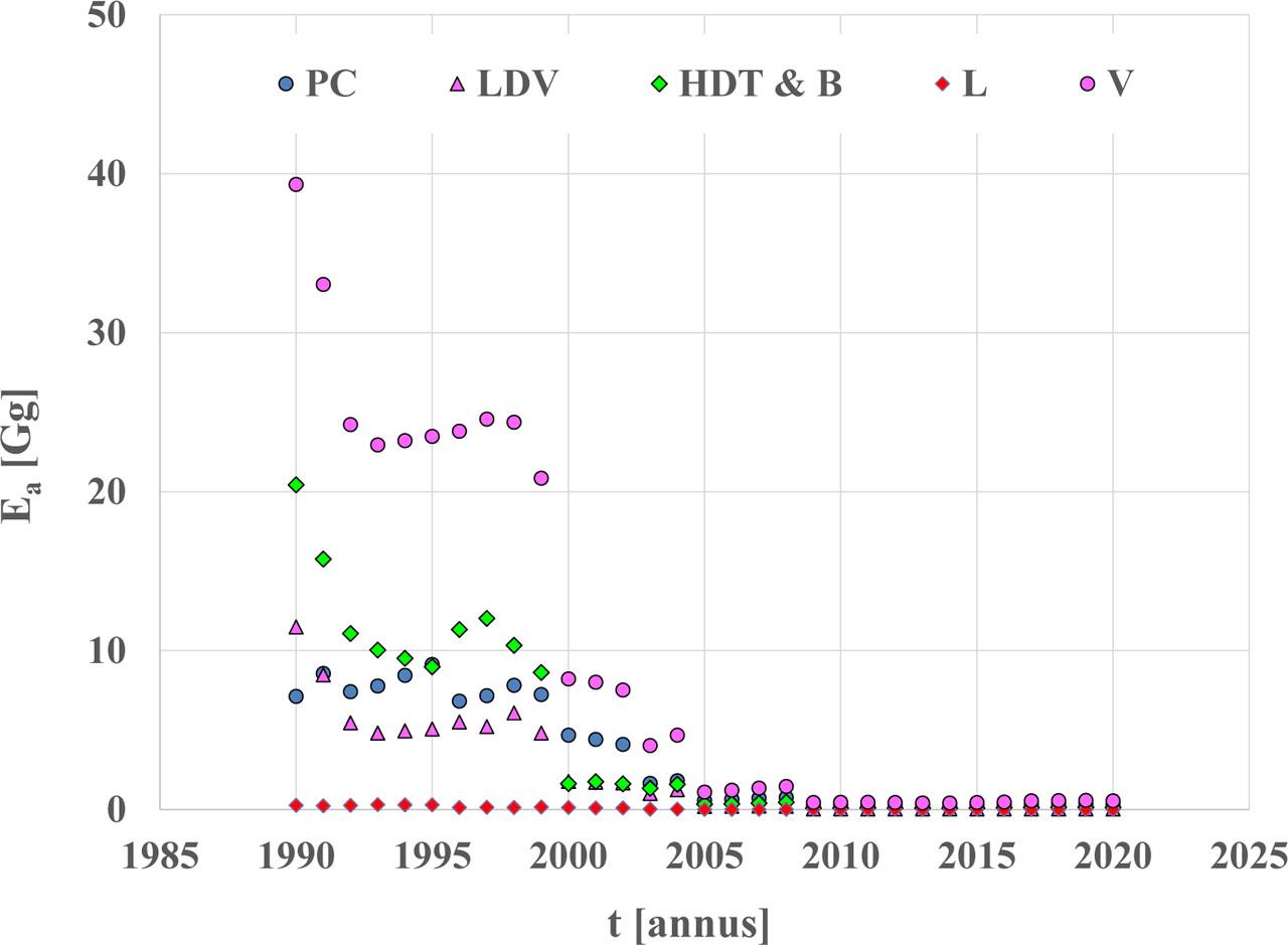 National annual emission - Ea of lead compounds - Pb for road vehicle categories: PC - passenger cars, LDV - light duty vehicles, HDT & B – heavy-duty trucks and buses, L - category L, V - road vehicles