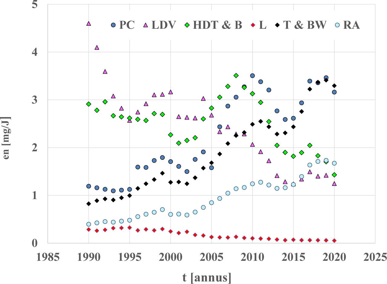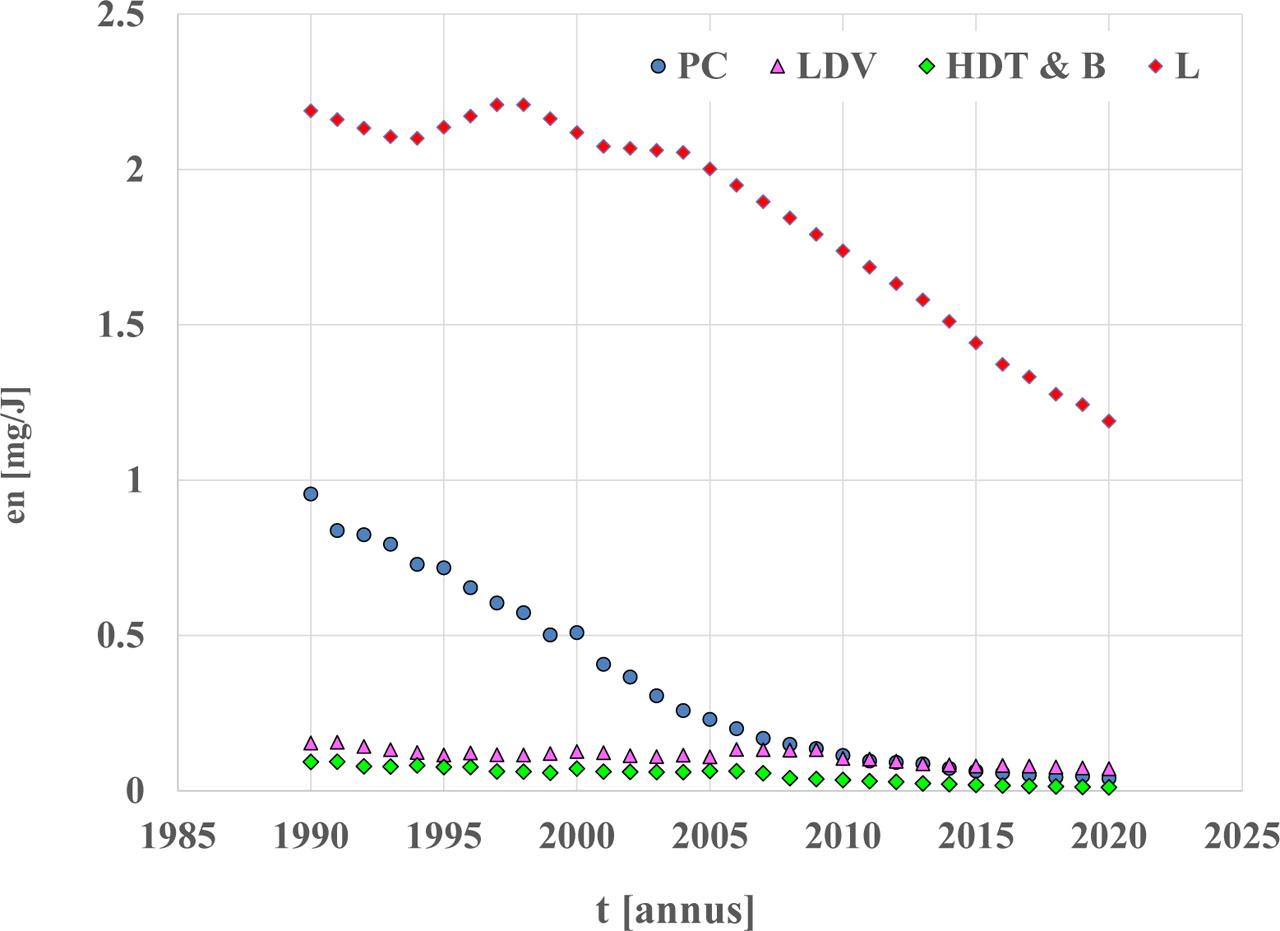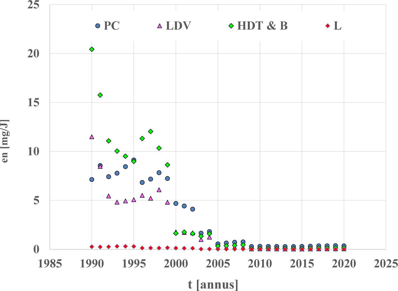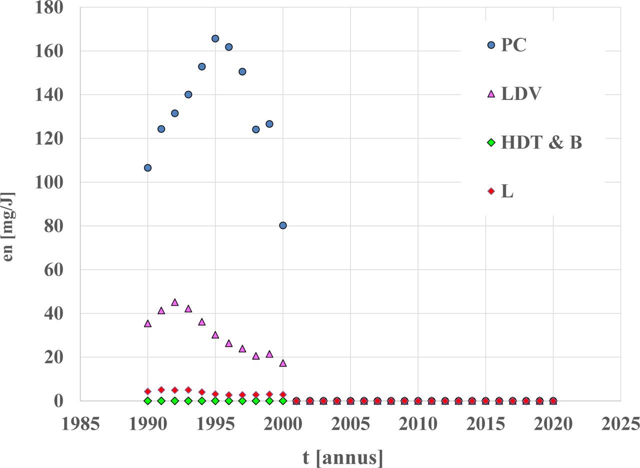 Evidently, in the case of lead and sulfur compounds, the energy emission factors have been decreasing since the beginning of the 21st century, due to a radical reduction of the content of these substances in fuels.
