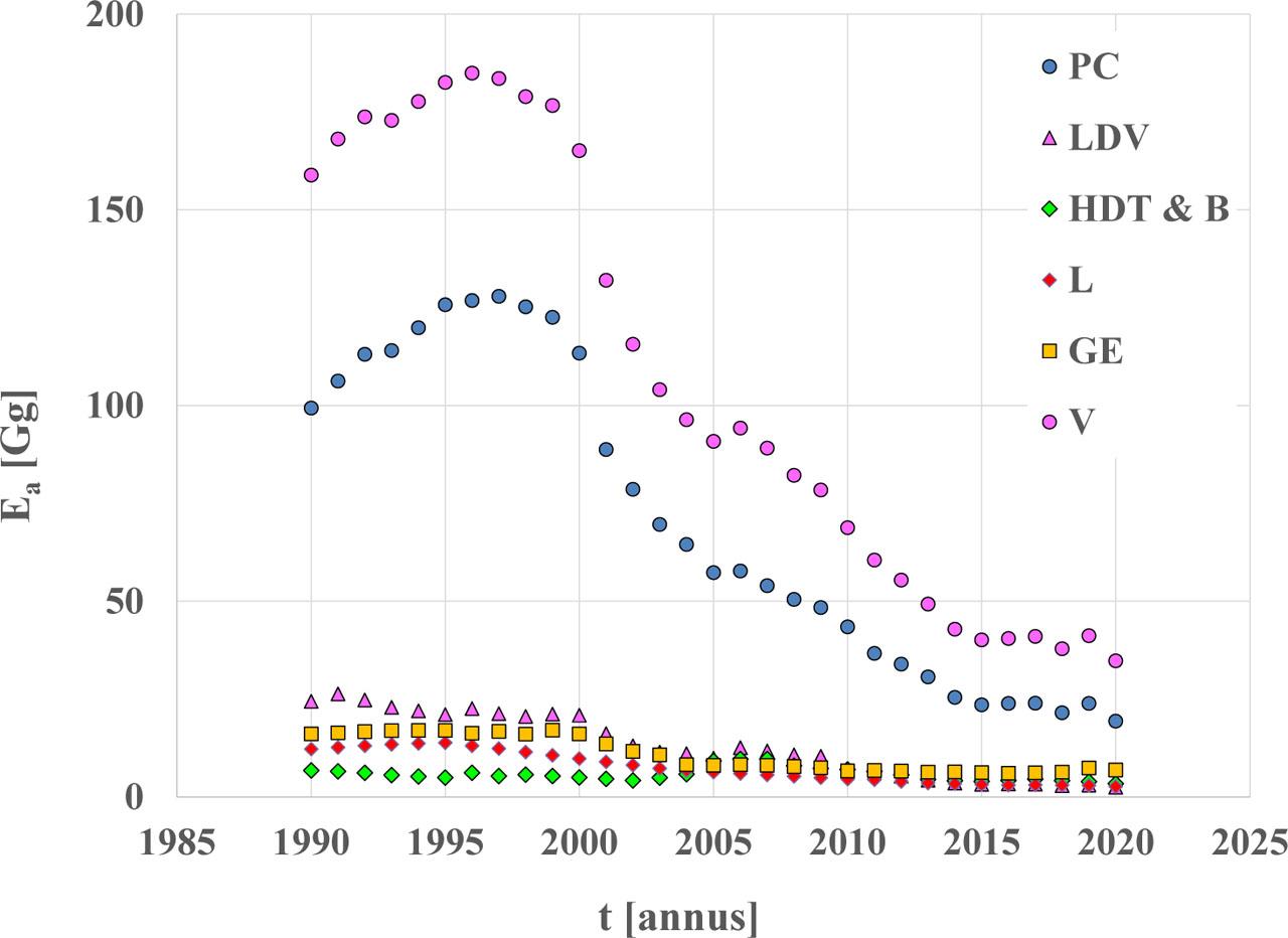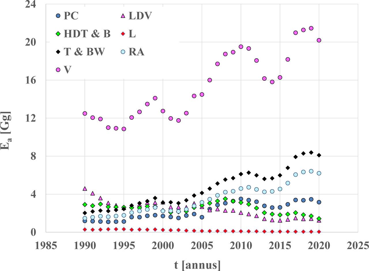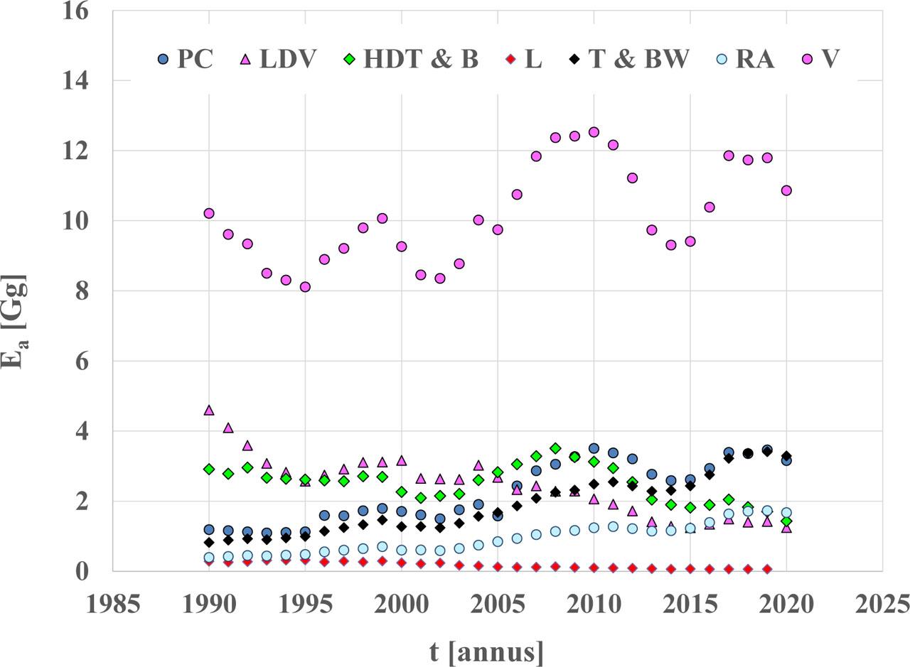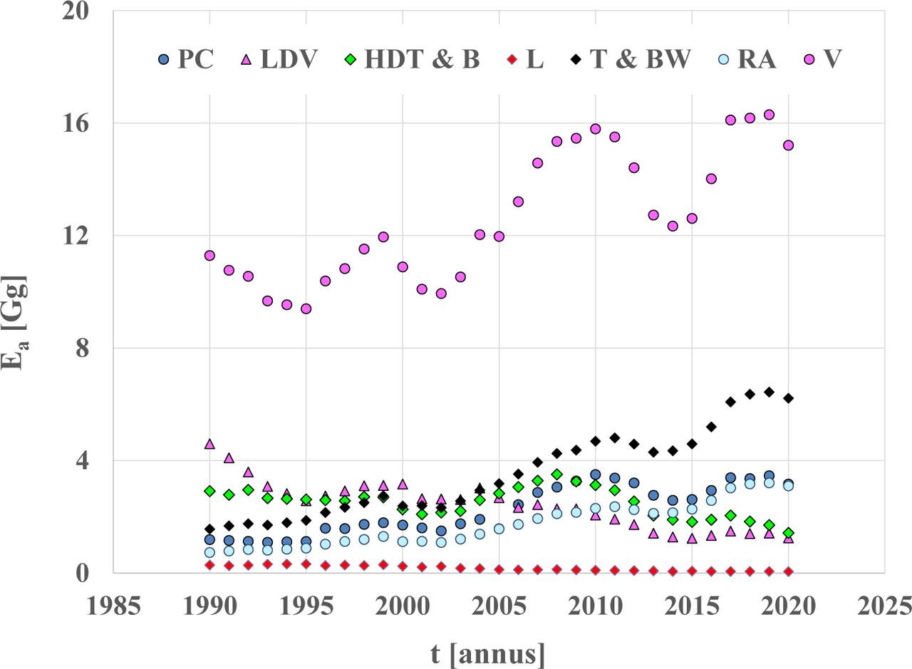 Evidently, in the case of lead and sulfur compounds, the energy emission factors have been decreasing since the beginning of the 21st century, due to a radical reduction of the content of these substances in fuels.