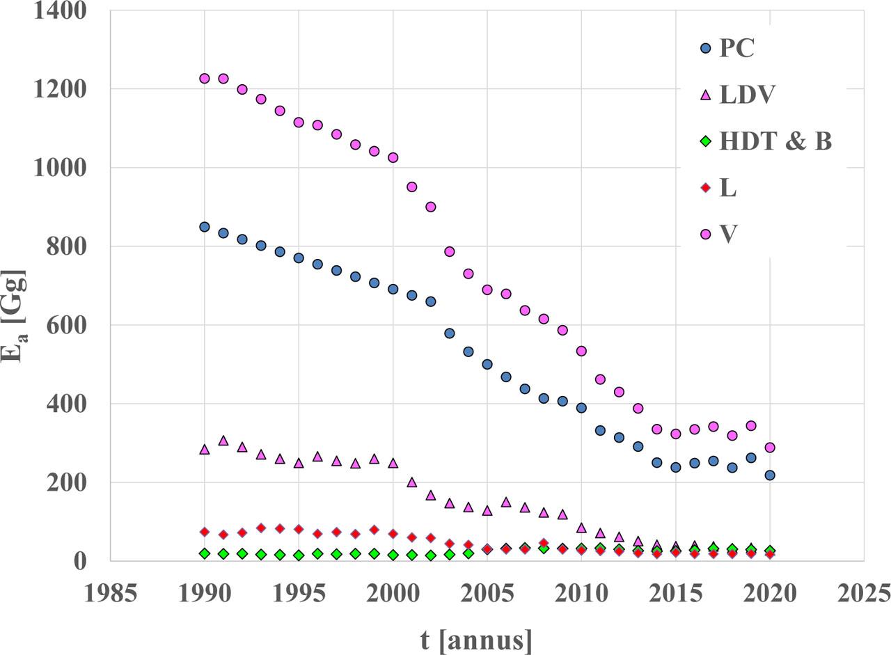 National annual emission - Ea of nitrogen oxides - NOx for road vehicle categories: PC - passenger cars, LDV – light duty vehicles, HDT & B – heavy-duty trucks and buses, L - category L, V - road vehicles