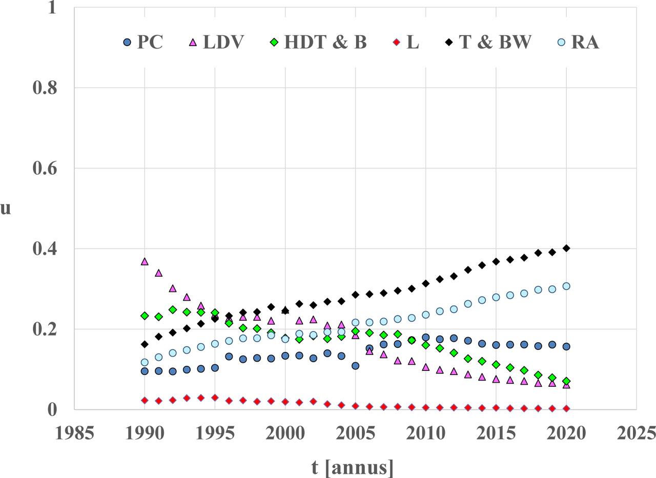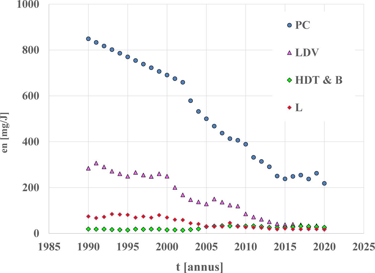 From among the zero-dimensional characteristics of pollutant emissions as they apply to the environmental impacts of vehicles from the designated categories, energy emission factors were taken into account [Chłopek et al. 2018]. The energy emission factor is a derivative of the pollutant emission against the energy consumed by the vehicle. The reason behind choosing such a characteristic is as follows: it is problematic to associate pollutant emissions with the mass of fuel consumed in the case of the analysed cumulative categories of road vehicles, and different fuel types are used. For instance, there is gasoline—for spark ignition engines and diesel oil—for compression ignition engines. Nonetheless, energy equivalents can be generally used for fuels consumed and other drive systems (chiefly electric drives). In fact, in the case of electric drives, in the emission inventory, the issue of taking into account pollutant emissions in connection with electricity generation and distribution remains unsolved. For the time being, this problem has not been appropriately addressed. On the other hand, admittedly, the share of pollutant emissions due to electric energy generation and distribution for road vehicle drives has not so far been substantial due to a relatively small proportion of electric road vehicles in the whole category of road vehicles. However, as the electrification of road transport develops, it will be necessary to modify the global emission models.