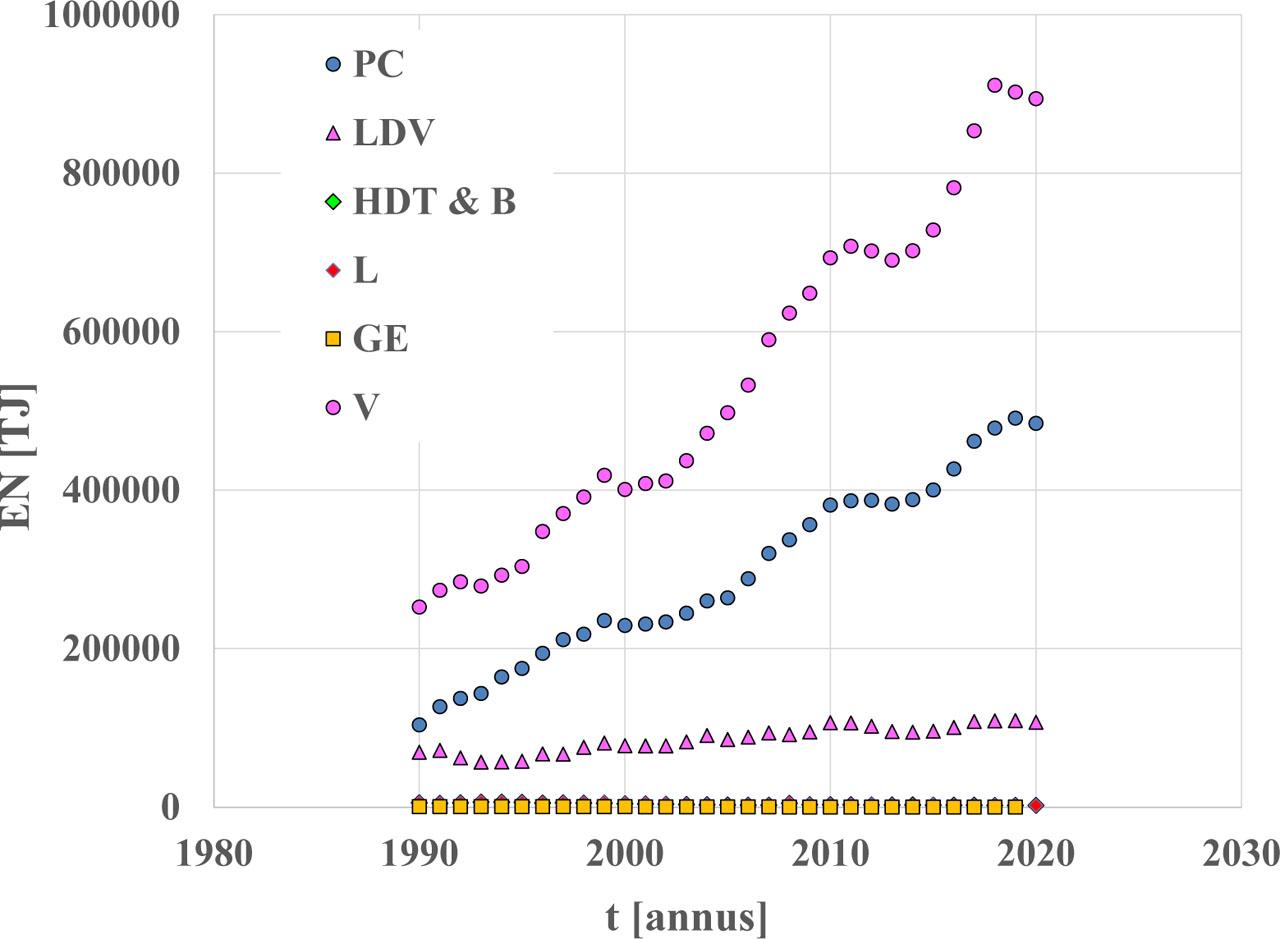 National annual energy consumption by road vehicles in the cumulative categories: PC - passenger cars, LDV - light duty vehicles, HDT & B – heavy-duty trucks and buses, L - category L, GE - fuel vapours, V - road vehicles