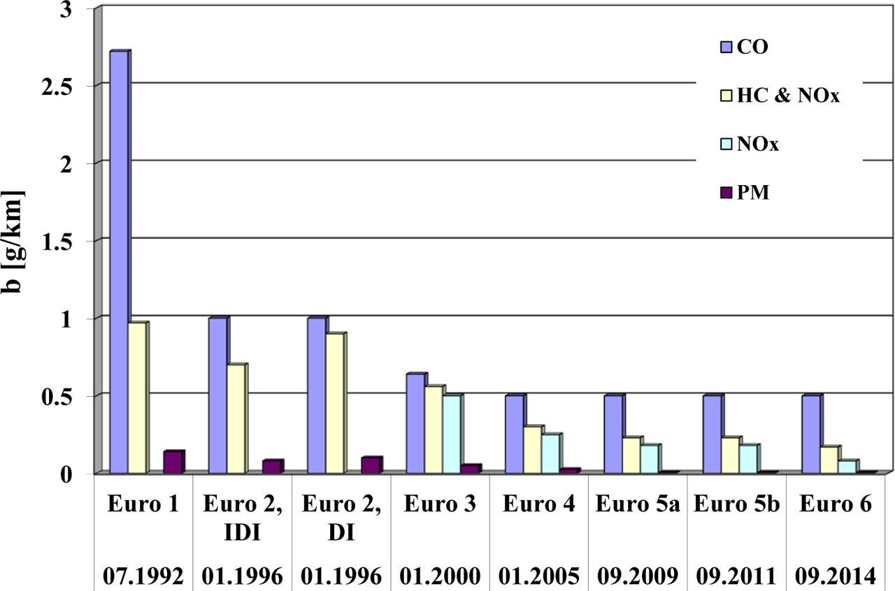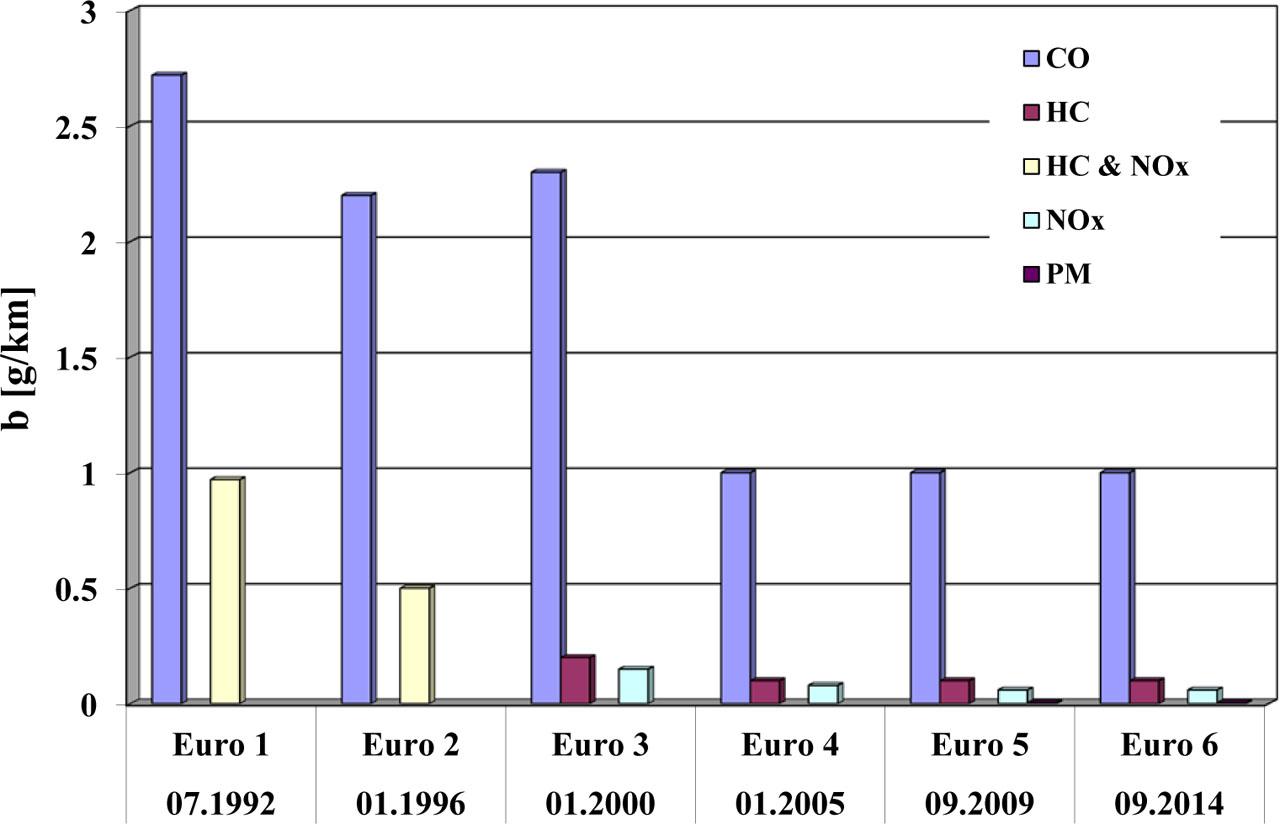 The difference in characteristics for the levels of regulations is clearly visible. The consequence of such a big difference between the binding limits of values characterising the emission of pollutants is the necessity to introduce to the market new vehicles with good environmental properties, which will result in a decrease in the annual emission of pollutants from road vehicles, notwithstanding the dynamic increase in their number and intensity of use.