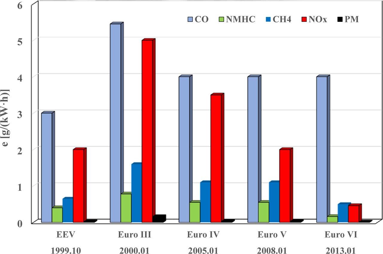 In engine testing for heavy-duty trucks and buses, a special category, EEV (Enhanced Environmentally Friendly Vehicle) was introduced in 1999 [DieselNet: Engine & Emission Technology 2022; Worldwide emission standards 2016/2017]. These are vehicles with particularly good characteristics in terms of emissions, used mainly in places with very high risk for people, i.e. in urban centres. EEV vehicles are predominantly urban buses, usually with spark ignition engines powered by natural gas. EEC vehicle engines, therefore, have the specific brake emission limits in static tests lesser than those for Euro V limits.