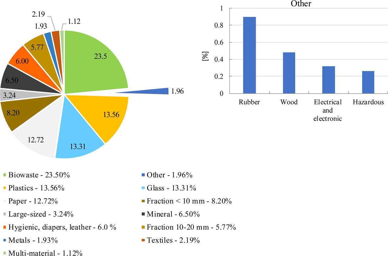 The methodology does not take into account homogeneous waste and types of waste other than mixed (unsorted) and separately collected waste (paper, metals, plastics, glass) collected from property owners and collected at municipal waste collection points. Wastes in the same material category and wastes showing the same properties according to the waste catalogue were each considered homogenous waste; these wastes include wood waste, medical waste, hazardous waste, textile waste, and others.