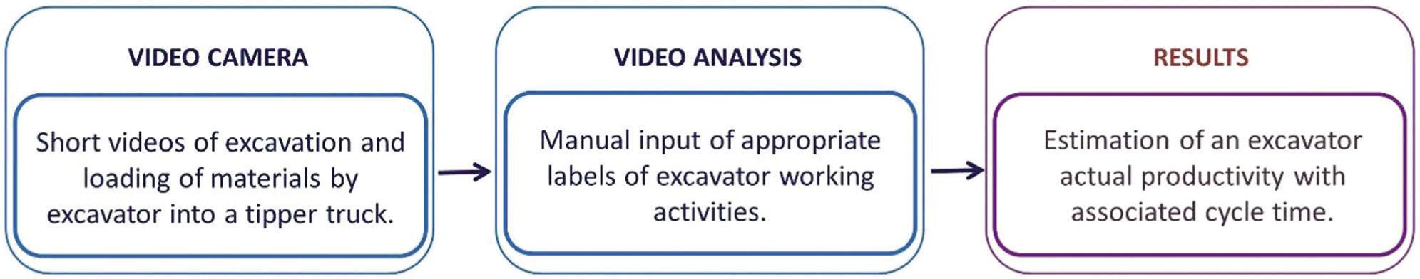 Lately, for the purpose of estimating the actual productivity of construction machinery at a construction site, researchers use a variety of methods and tools of fast-growing wireless technologies, such as (non-vision-based) sensing and tracking technologies (Montaser and Moselhi 2012–2014; Montaser et al. 2012; Ibrahim and Moselhi 2014; Alshibani and Moselhi 2016), and vison-based technologies (Bügler et al. 2017; Chen et al. 2020; Kim J. and Chi 2020). The vision-based methods can visualize the equipment state directly from images and videos, so that it becomes easy to identify false recognition and analyze the reasons behind low productivity, whereas the non-vision-based methods have difficulty in categorizing the activities in detail and they require attaching sensors to monitor the equipment (Chen et al. 2020). Different approaches are available to monitor earthworks equipment using computer vision; the first approach is to develop (or use) software to analyze the visual capture from common electronic tools, such as video cameras, and the second method is to employ other sensing devices together with video cameras to obtain more data from the scene (Rezazadeh Azar et al. 2013). This paper will be oriented toward researches that involve video camera and video analysis.