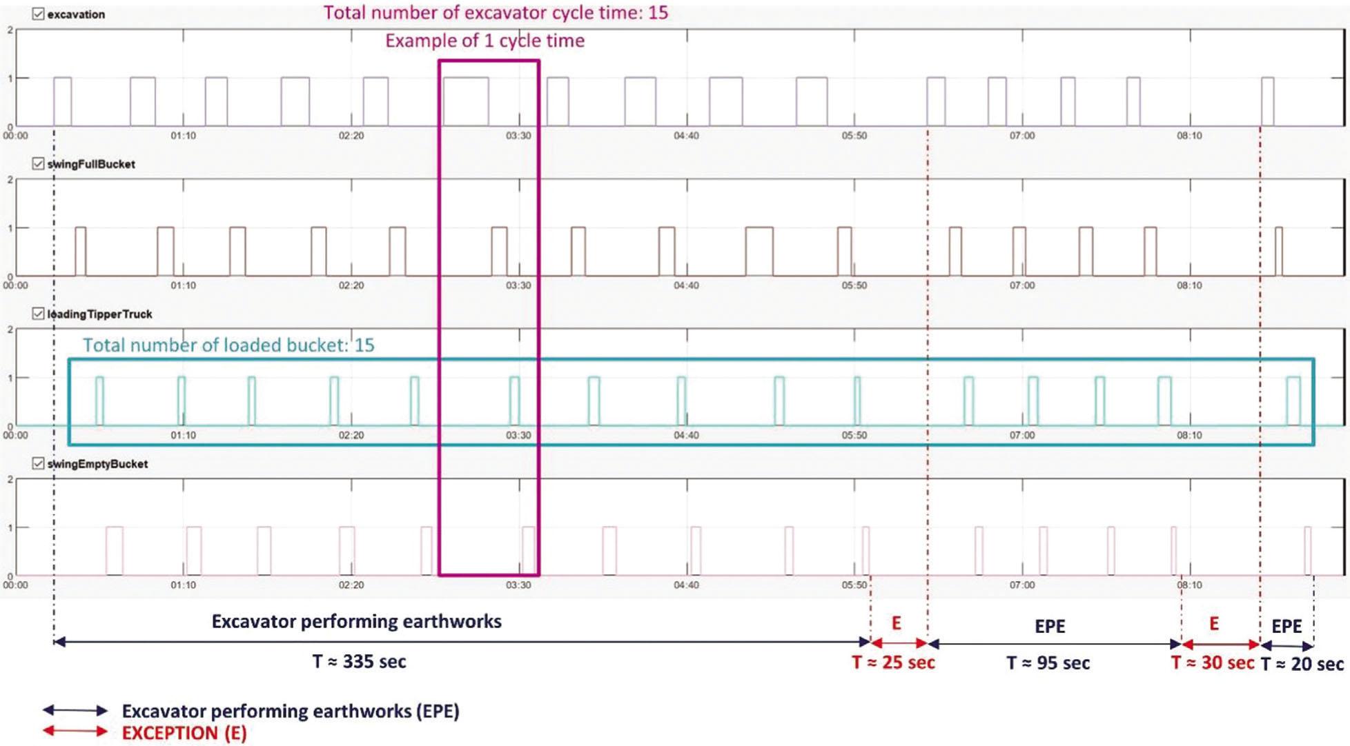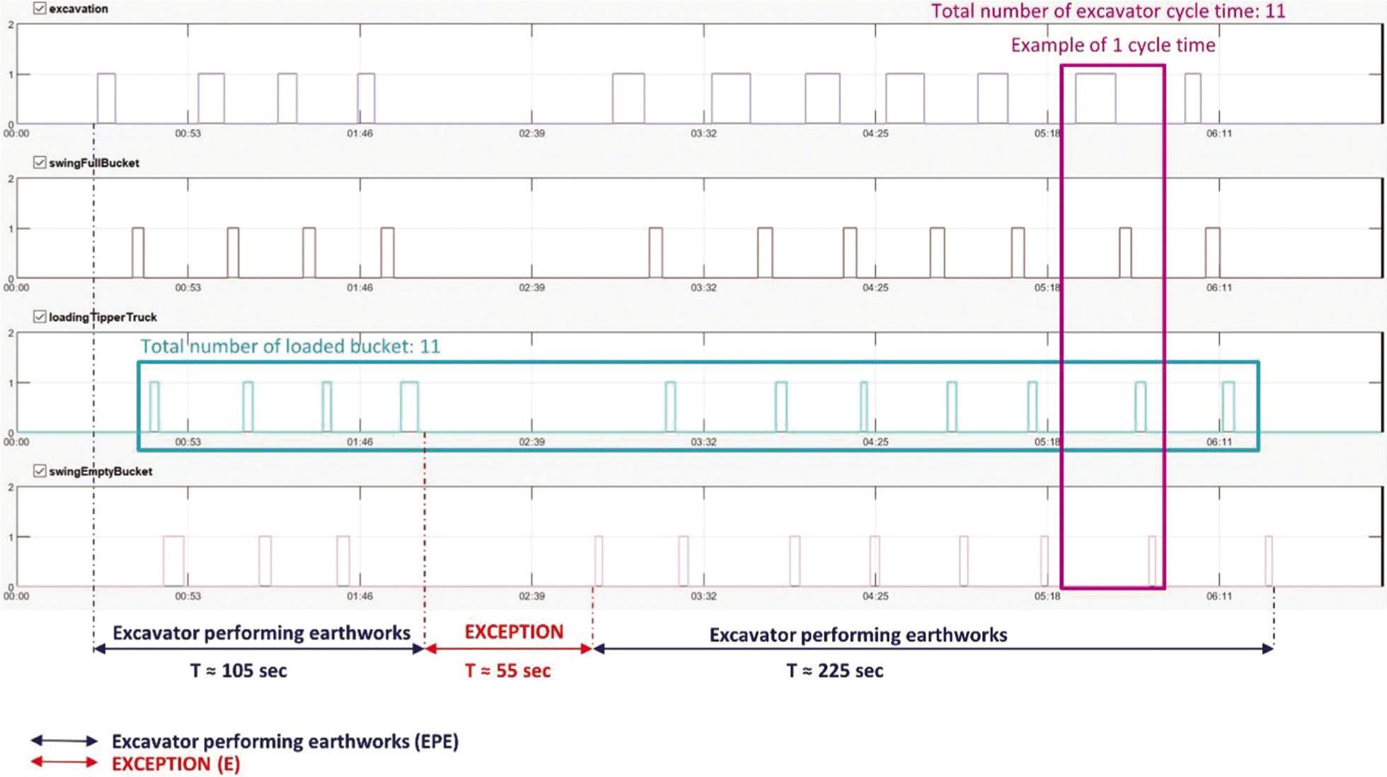 After labeling the excavator working activities, we can extract the labels from both videos to see the results (Figures 4 and 5). By displaying the results of labeling from the first video (Figure 4) we can enumerate that tipper truck was loaded with 11 buckets of the excavator. Also, we can enumerate 11 repeated excavator working cycles, which is, obviously, matching with the number of loaded bucket of the excavator. However, we can notice that there is an exception, or deadlock, in working cycles of the excavator. The exception is caused by the site manager who came to convey some information to the operator of the excavator. Although the deadlock was justified, the duration of the excavation and loading of materials by excavator into the tipper truck was extended.