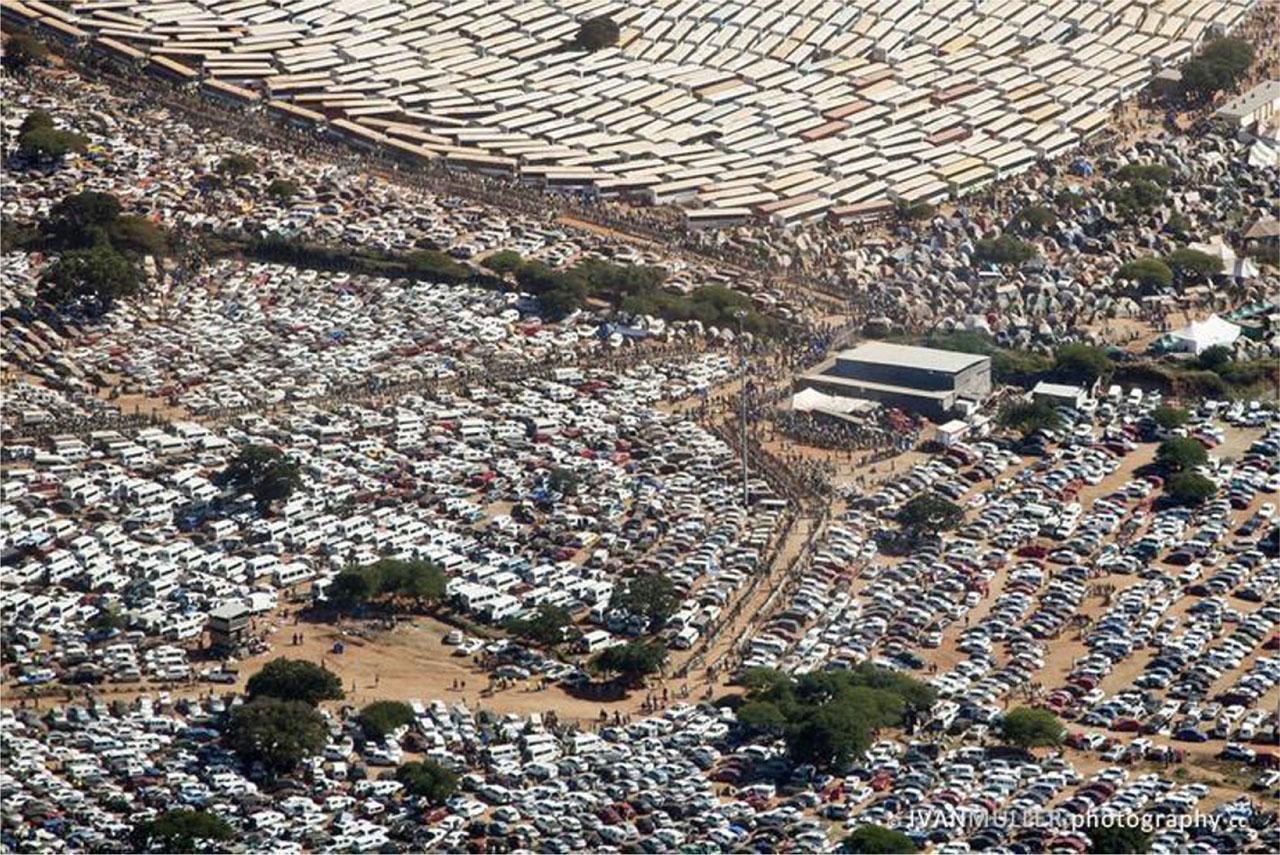 The pilgrims who visit ZCM are exponentially increasing every year. For example, during the 2016 Easter Weekend; 12 million pilgrims were hosted at ZCM and during the Easter weekend of 2017, the number of pilgrims increased to 13 million (Lekganyane 1997). There is a great likelihood that several pilgrims are likely to reach 16 million in 2019. The buses, minibuses and private cars are solicitously parked in the Holy City of Moria by the volunteers under the supervision of the church management. After the pilgrimage, the traffic is ushered out of Moria systematically without the church members gate tailing one another. The culture of obedience is paramount among the ZCC membership. An aerial photo of Moria during the Easter weekend pilgrimage is shown in Figure 1.
