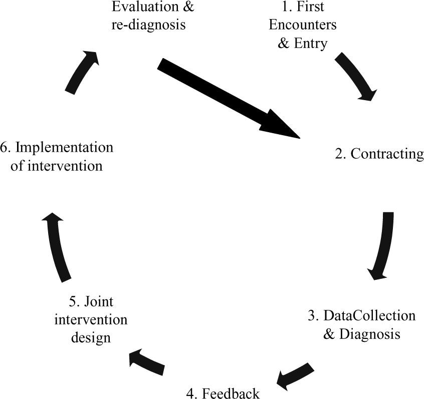 The high volume of vehicular traffic to ZCM during the Easter weekend is a challenge to motorists, pilgrims, communities and the three spheres of government. The researchers used the seven-step model proposed by Van Tonder and Dietrichsen (2008) as graphically demonstrated in Figure 2 below. The justification of the model is that it is aligned with the action research model of Organisational Development (OD). It requires that a diagnosis process should be collaborative and participative towards offering solutions to organisational challenges as opposed to imposing a unilateral theoretical generated solution. This model also fits the ontological stance of the researchers which assumes that reality is co-constructed through engagement.