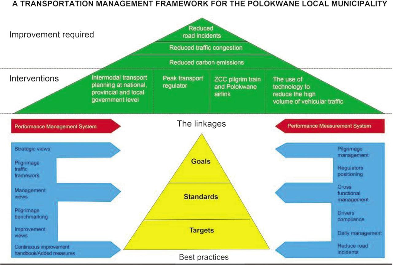 Figure 3 is a transport management framework for PLM. The framework below depicts the improvement required, interventions as well as the linkages. Performance measurement is a confluence of goals, standards and targets catalysed with efficiency or effectiveness. In the framework, performance measurement is linked to performance management through the setting of goals, standards and targets for improving the performance of the municipality.