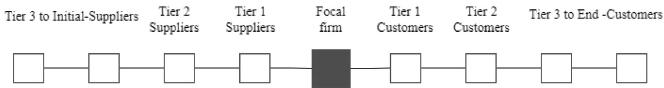 Vertical collaboration: A collaboration when two or more organisations at different levels or stages of the chain work together, sharing responsibilities, resources and information to serve the end customer. A vertical link chain connects the first supplier in several ways to the end customer. Vertical alignment has always been directed at both the business-to-supplier relationship and the business-to-end customer (Christopher 2011). Vertically linked supply chain structure is shown in Figure 1.