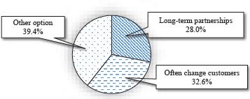 In the matter of maintaining relationships with customers (investors), many respondents said that construction enterprises maintain long-term partnerships with customers (28%). Some people (32.6%) said that construction enterprises often change customers according to different projects, and the other option is 39.4% (Figure 5). Each construction enterprise will make a decision suitable to the specific situation. Investors (customers) can be professional people in the field of construction or can also be people/agencies who only invest in building the project once. In this case, the construction enterprise will cooperate with the new customer/investor according to each project. At the same time, construction enterprises maintain long-established relationships with investors operating in the field of construction.