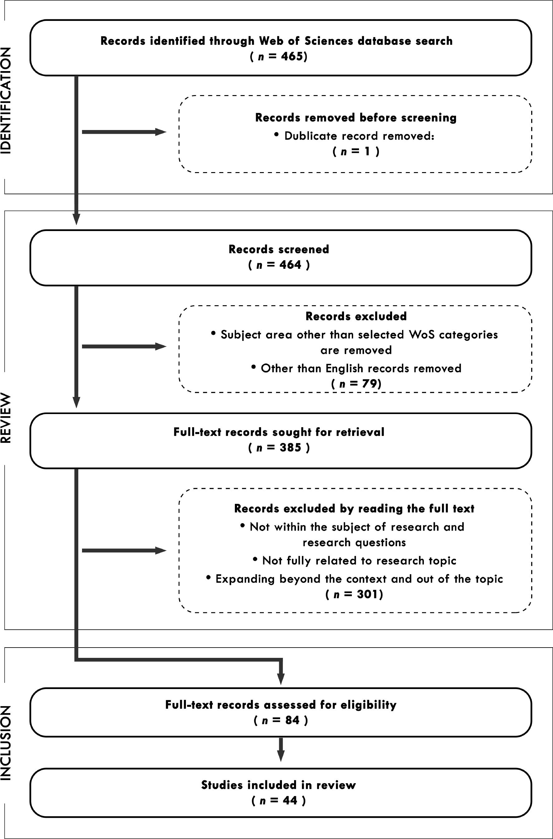 After duplicates were removed, 464 articles were evaluated. Additional filtering based on specific parameters, such as field (AE), publication language (English) and publication type, excluded 79 records. Well-defined inclusion and exclusion criteria were implemented, and all studies were reviewed in full text. This process resulted in the selection of 44 articles.
