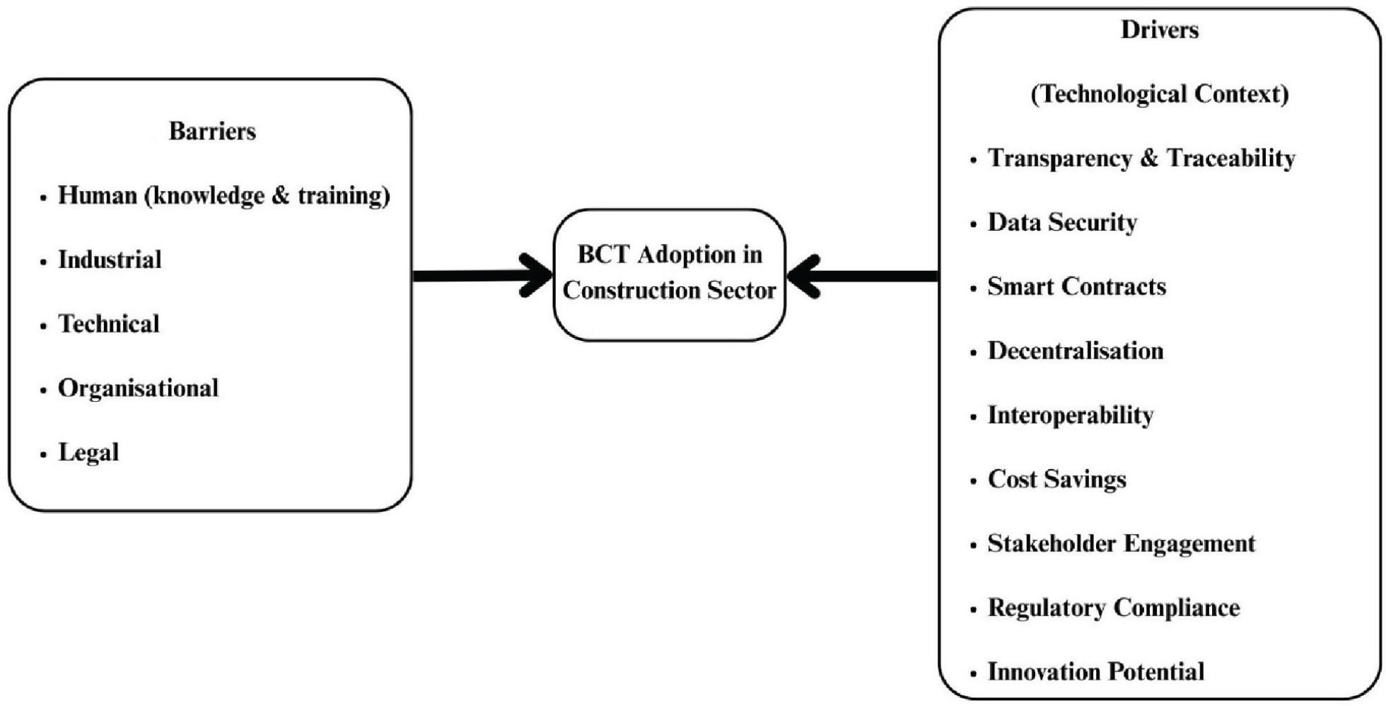| Industrial | Impact of lower incentives among clients or project owners to embrace BCT solutions in construction projects | Lack of encouragement of clients or project owners to embrace BCT solutions in construction projects | Anuradha et al. (2023) and Li et al. (2019) |