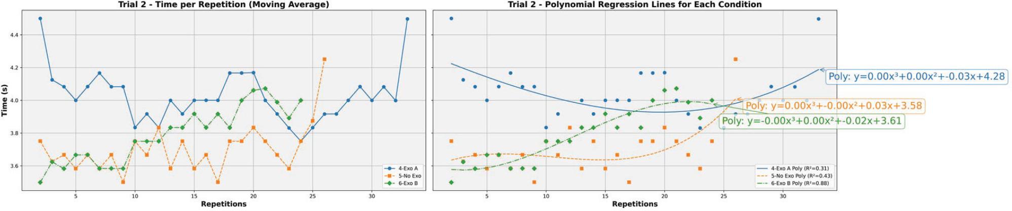 Figure 5 illustrates trial 1. Initially, even though No Exo was the first set, it shows a relatively higher time per repetition compared with Exo A and Exo B. On the contrary, IPO in No Exo and Exo B was higher compared to Exo A. Though, Exo A seems to maintain a consistency in time, indicating sustained energy and overall better CE. Moreover, a lower DR compared to Exo B and No Exo was also indicated illustrating the ability to maintain initial performance.