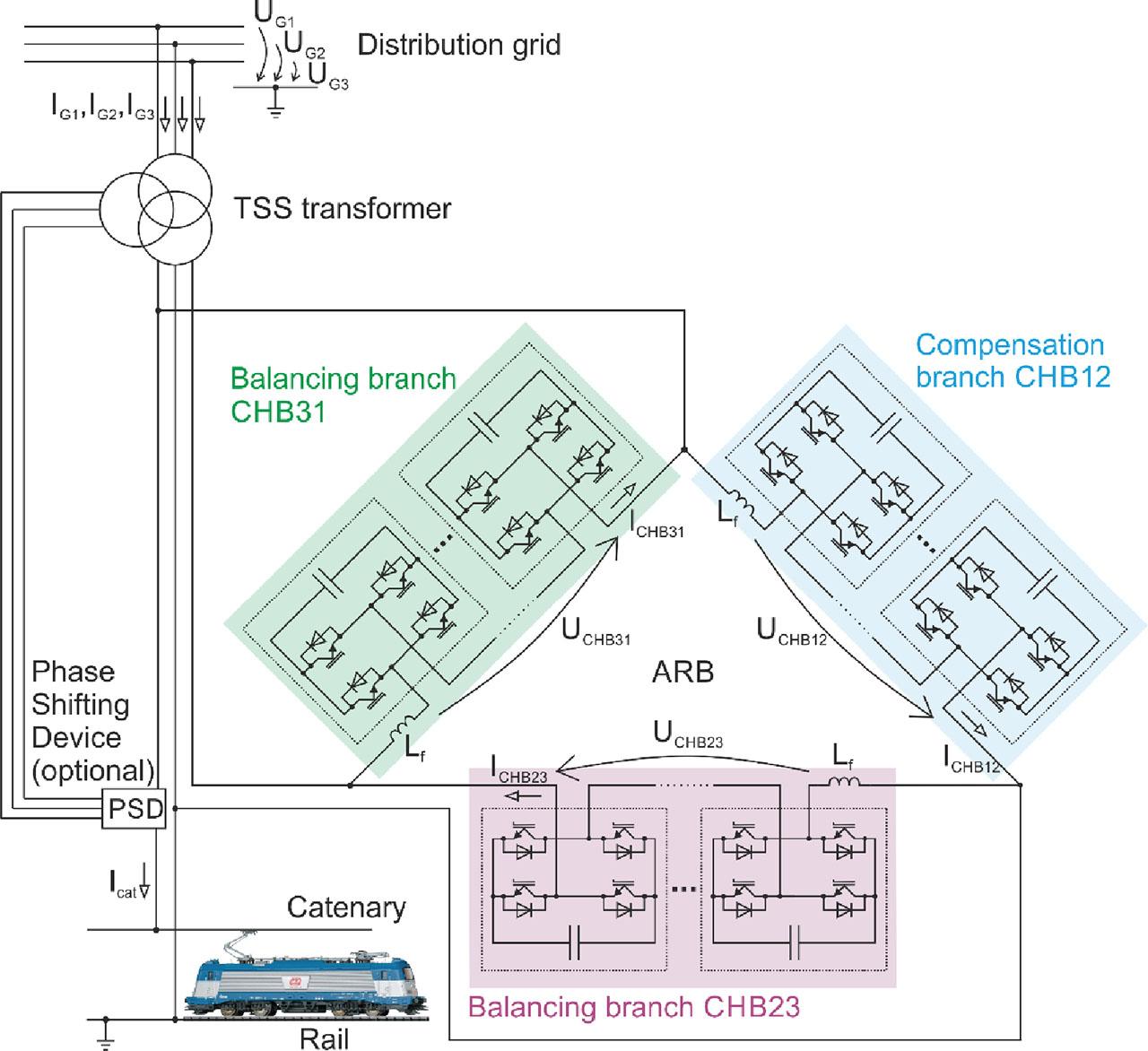 We introduce a novel solution called the advanced rail balancer (ARB), which has shown promising results. The ARB is designed for the 25 kV/50 Hz traction catenary system used in Central and Eastern Europe. Its configuration is shown in Figure 1 and includes a three-phase TSS transformer for voltage adjustment and galvanic isolation, an electronic balancer and a phase-shifting device. The core of the system is the electronic balancer, which provides full power symmetrisation. In addition to this primary function, the device also compensates for reactive power and filters high-harmonic currents. The phase-shifting device adjusts the voltage output vector to enable coordination with nearby TSSs and eliminates the need for neutral sections (voltage-free zones). Moreover, the system offers limited functionality in the event of a failure of any electronic component, which is advantageous in terms of TSS reliability and overall cost compared to TSSs using static frequency converters (SFCs). Both solutions (ARB and SFC) are described and compared in more detail in Straka et al. (2021).