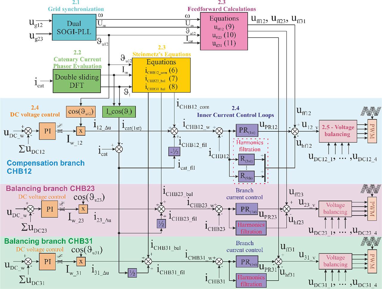 The required catenary filtration current icat_fil is calculated as the difference between the actual catenary current icat and the fundamental harmonic of the catenary current icat(1st) estimated by SDFT. The required filtration current is equally divided into two parallel branches: (1) compensation branch CHB12 iCHB12_fil = −1/2 icat_fil and (2) the entire symmetrisation branch, consisting of a series connection of CHB23 and CHB31 branches iCHB23_fil = iCHB31_fil = 1/2 icat_fil. However, the harmonic current distribution in parallel branches can be freely selected, for example, with respect to branch power losses.