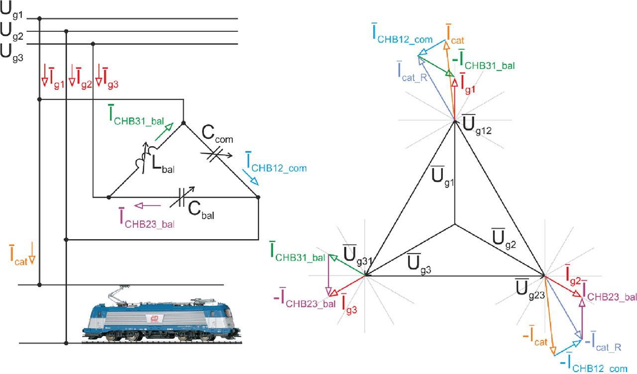 Defining symmetrisation and reactive power compensation of a single-phase load connected to the TSS catenary is based on Steinmetz’s equivalent circuit and explained by a phasor diagram in Figure 3. The balancing current calculation depends on the catenary current amplitude and its phase shift relative to the grid voltage [Eqs (4) and (5)]. Eqs (6)–(8) describe ARB reactive power compensating and balancing currents of individual CHB branches based on the catenary current. The Icat_m is the catenary current magnitude, ϑu12 is the voltage vector angle (line to line Ug12 voltage angle) and ϑi is the current vector angle of the catenary load. The calculated currents iCHB12, iCHB23 and iCHB31 are used as a fundamental harmonic current reference for the ARB inner current loop.