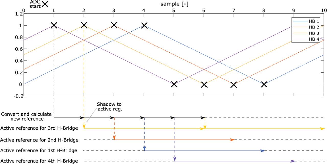 This means that, at a given instant, it takes 1 sample time for the measured values to be processed and set as the active output voltage reference for the first converter, 2 sample times for second converter up to 4 sample times for the fourth converter. This reference remains active for a duration of four samples before being replaced by a new value.