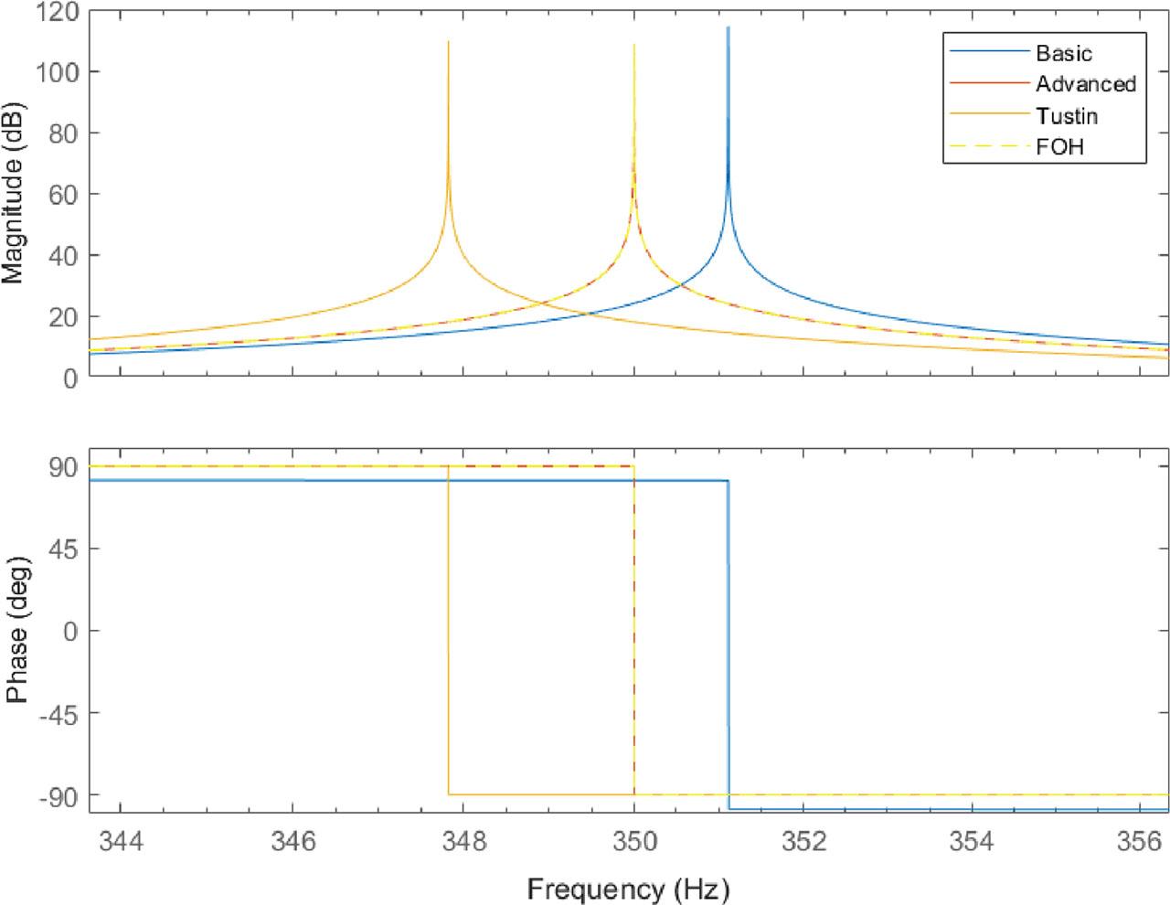 The Tustin and FOH R controller implementations are in Eqs (30) and (31), respectively. Both the Basic and the Tustin discretisation methods shift the resonant frequency, each in the opposite direction (Figure 5). In contrast, the proposed advanced R and the FOH R controllers yield identical results, which perfectly match the ideal R controller characteristics.