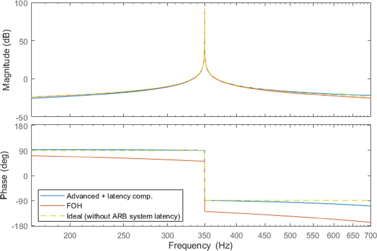 Bode’s characteristics of discrete R controllers with ARB control system latency and ideal characteristic of continuous R controller without latency. ARB, advanced rail balancer; FOH, first-order hold.
