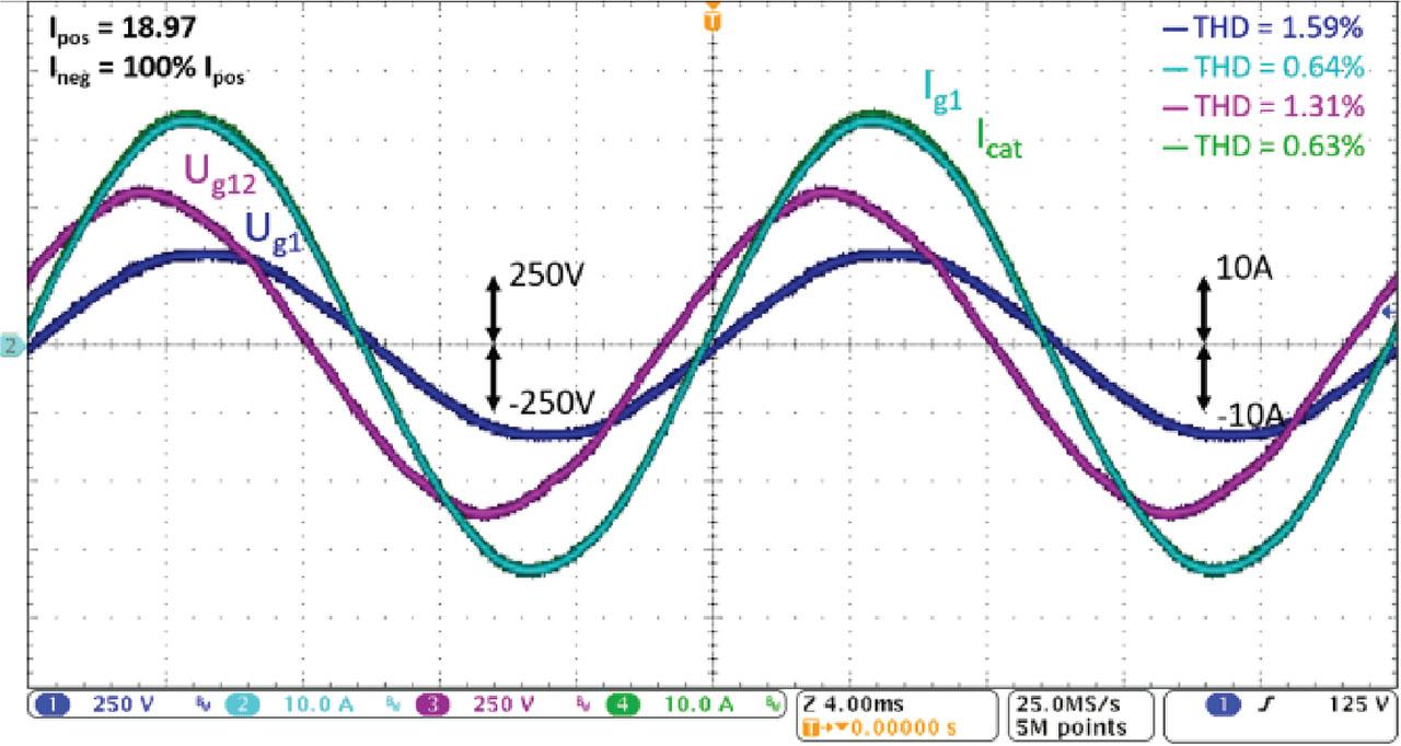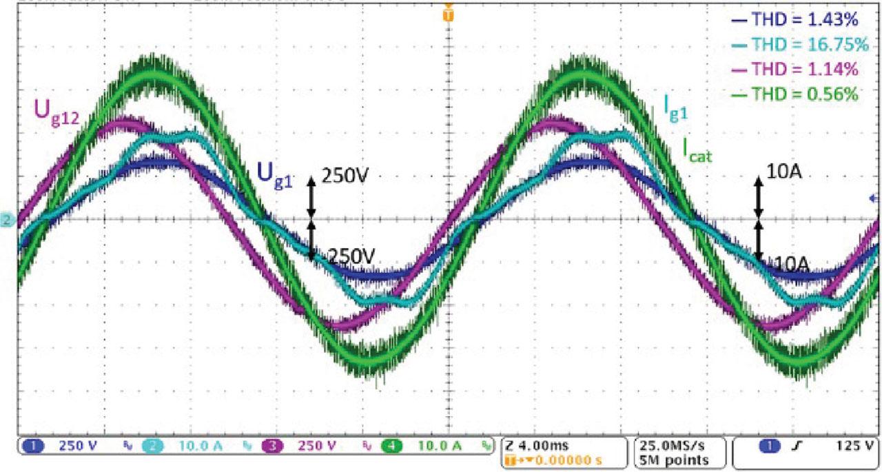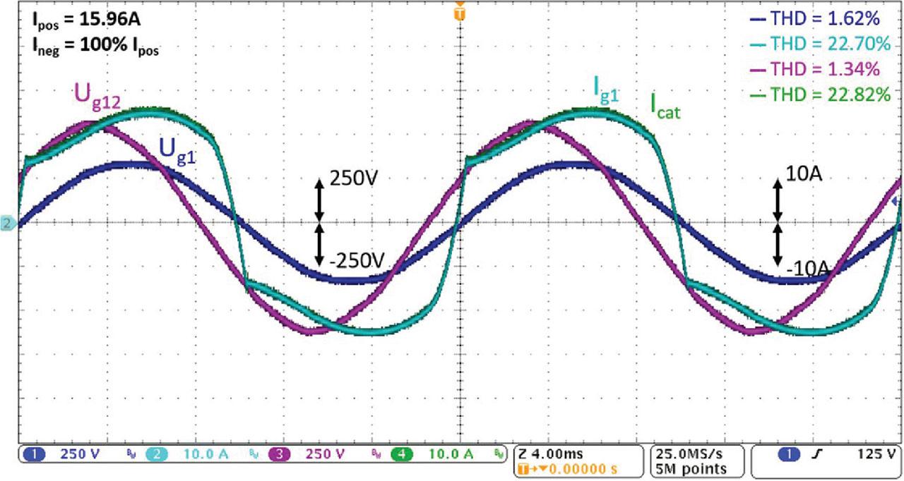 RL load, ARB—balancing ON + harmonics filtration OFF, blue Ug1 [250 V/div], cyan Ig1 [10 A/div], purple Ug12 [250 V/div], green Icat [10A/div]. ARB, advanced rail balancer; THD, total harmonic distortion.