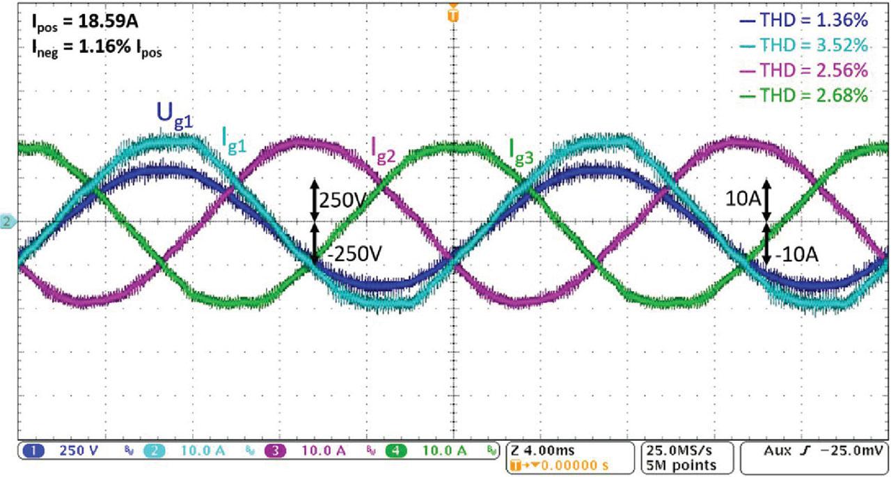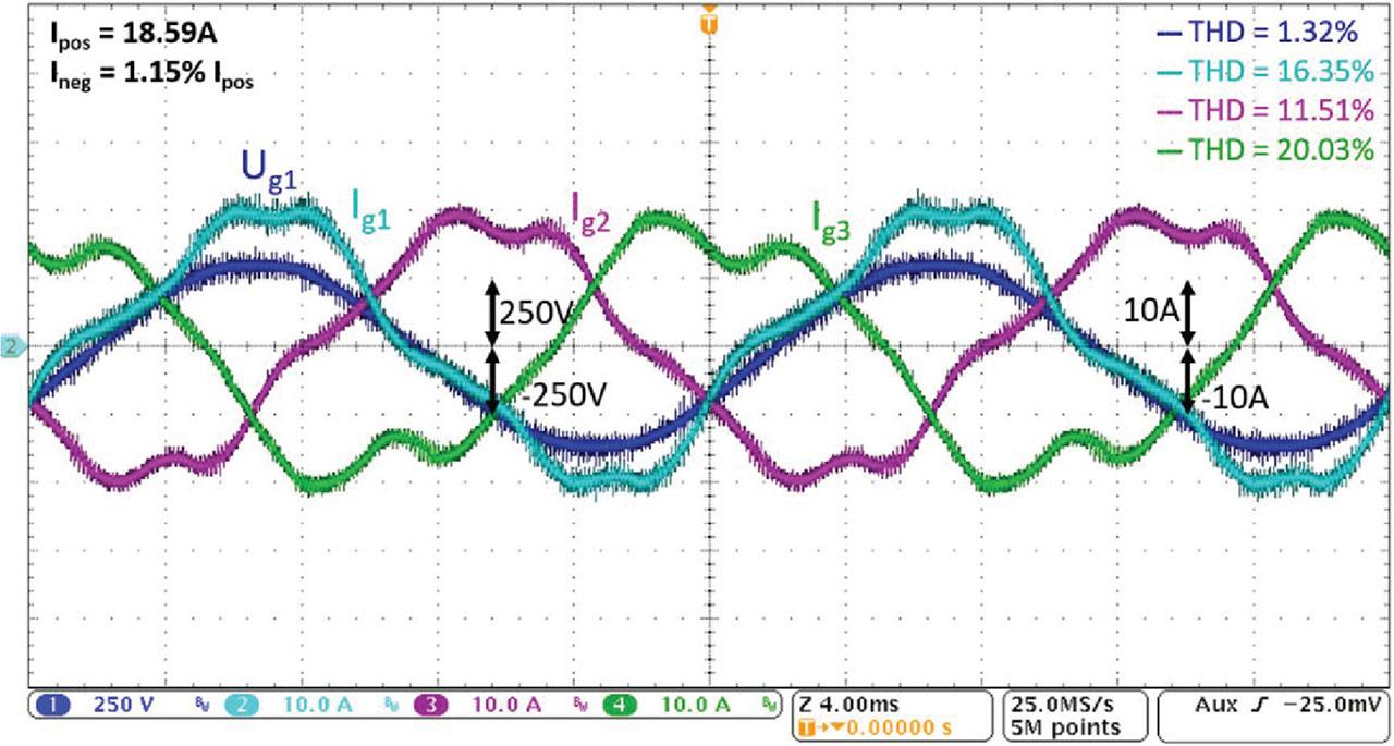Load: Diode rectifier with RL load, ARB—balancing ON + harmonics filtration ON with advanced R controllers, blue Ug1 [250 V/div], cyan Ig1 [10 A/div], purple Ig2 [10 A/div], green Ig3 [10 A/div]. ARB, advanced rail balancer; THD, total harmonic distortion.