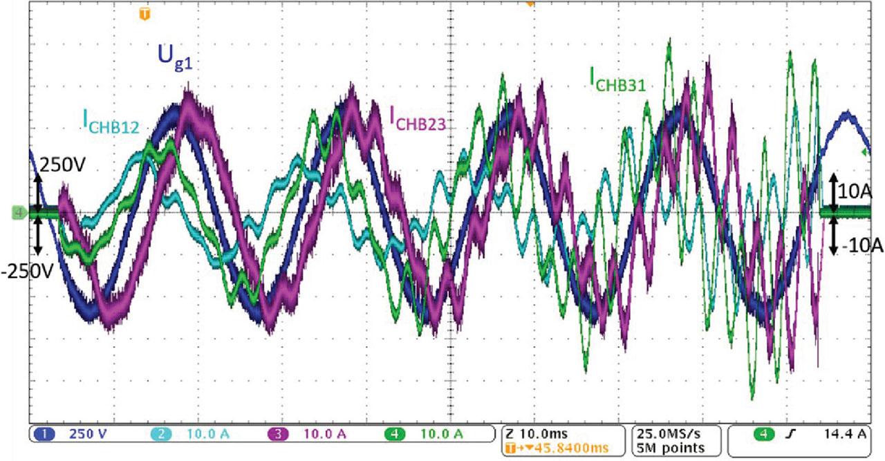 Figure 16 presents the internal ARB (CHB) branch currents during operation with both balancing and harmonics filtration active. Approximately 50% of the harmonic content of the load current is filtered by the CHB12 branch (ICHB12), and the remaining 50% is handled by the CHB23 and CHB31 branches (ICHB23, ICHB31).