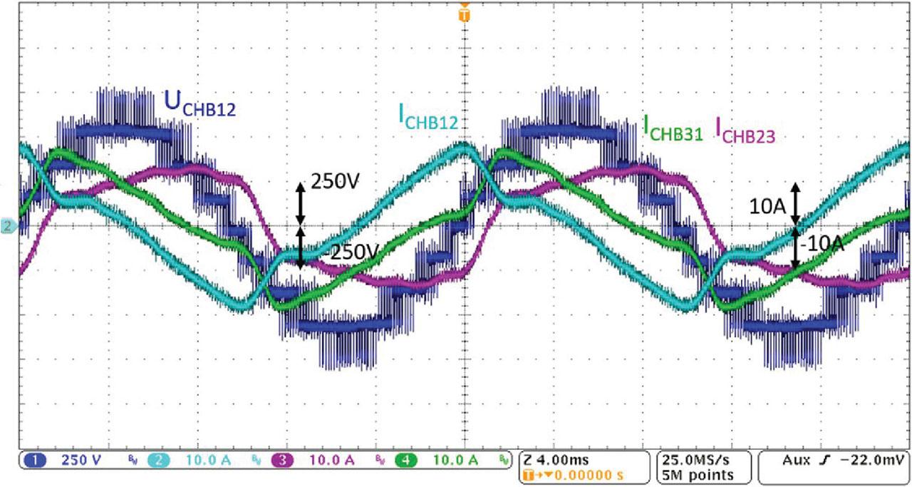 Load: Diode rectifier with RL load, ARB—balancing ON + harmonics filtration ON with advanced R controllers, blue UCHB12 [250 V/div], cyan ICHB12 [10 A/div], purple ICHB23 [10 A/div], green ICHB31 [10 A/div]. ARB, advanced rail balancer.