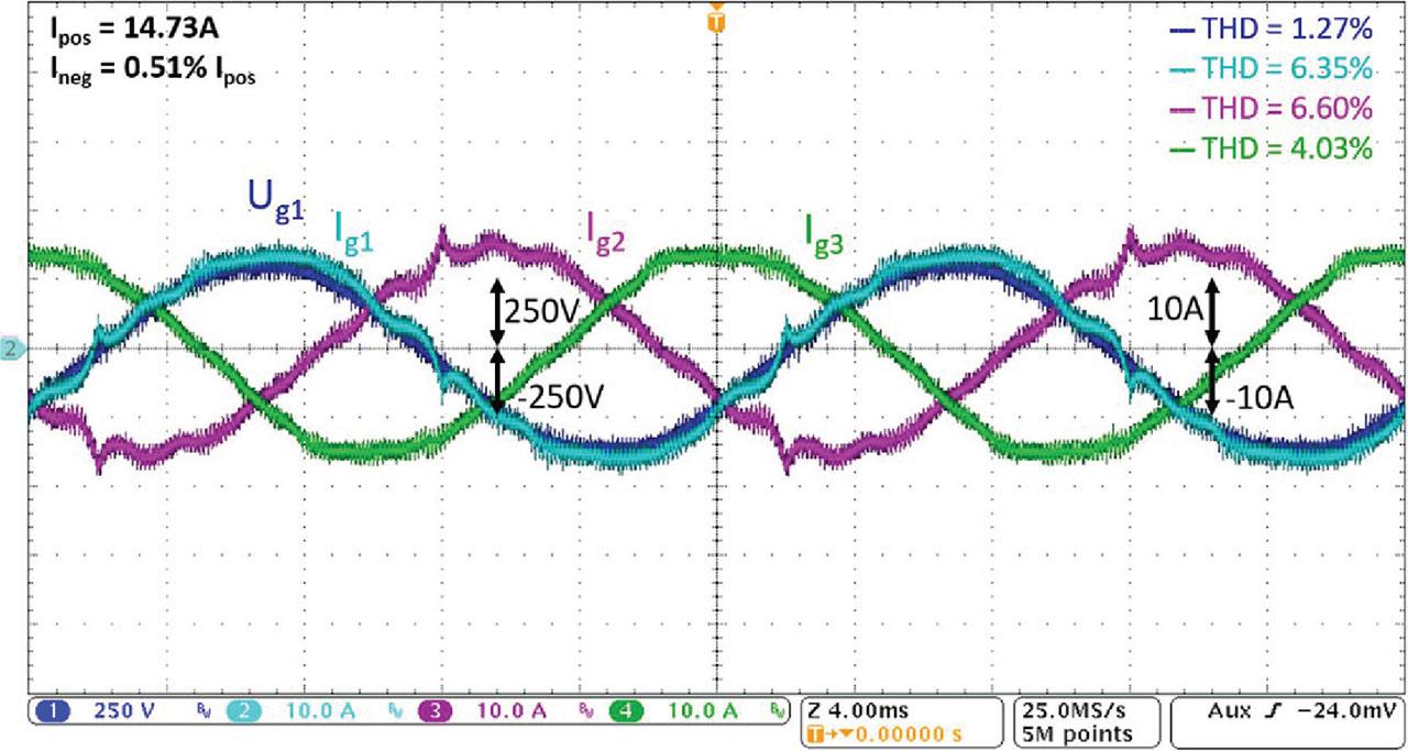 RL load, ARB—balancing ON + harmonics filtration OFF, blue Ug1 [250 V/div], cyan Ig1 [10 A/div], purple Ig2 [10 A/div], green Ig3 [10 A/div]. ARB, advanced rail balancer; THD, total harmonic distortion.