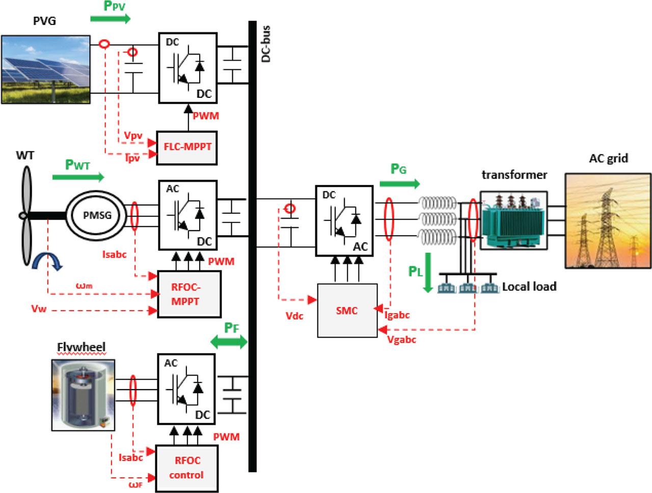 | Our paper | Grid-connected PV/wind/flywheel | This system features a multi-layered control approach that combines FLC, PID control and SMC into a unified EMS. |