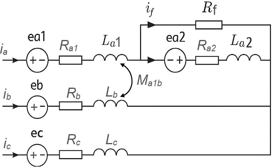 The resistance of the healthy portion of the phase is presented by Ra1 while the resistance of the inter-turn circuited portion is represented by Ra2 and Tfault and Ttotal are, respectively, the number of shorted turns in the sub-winding and the total number of turns per phase.