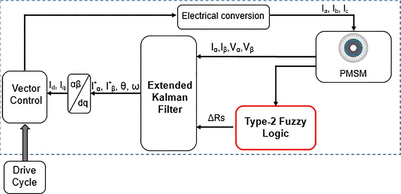 Considering that the ITSC fault contributes to a progressive degradation of torque and overheating of the windings, which provides uncertainty and noise on the stator resistance measurement and in extreme cases, a complete failure of the propulsion system, we proposed in our previous method (Romdhane et al., 2023), an approach that unites the EKF’s analytical precision with the conventional FL to approximate the stator resistance and detect ITSC fault. Nevertheless, these approaches show uncertainties in estimation under demanding operating conditions. In particular, the detection of initial ITSC faults is characterised by a weak signature or low visibility, which exhibits insufficient reliability when the defect is subtle, leading to critical non-detections. Based on this model and the theoretical background study, we are motivated in this work to upgrade the previous fuzzy logic–extended Kalman filter (FL–EKF) model to a hybrid type-2 fuzzy logic and extended Kalman filter (T2-FL–EKF).