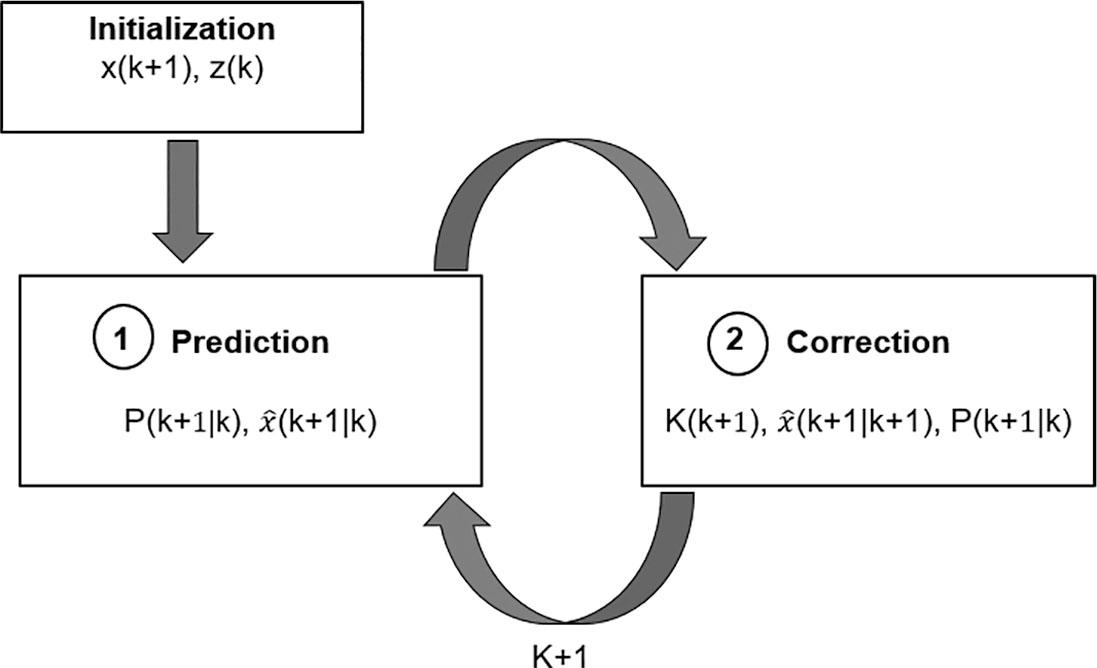 When the measurement becomes available, the correction phase includes the updates beginning from the gain parameter K(k + 1) followed by the updated error covariance matrix update P(k + 1 | k + 1), which are calculated as follows: