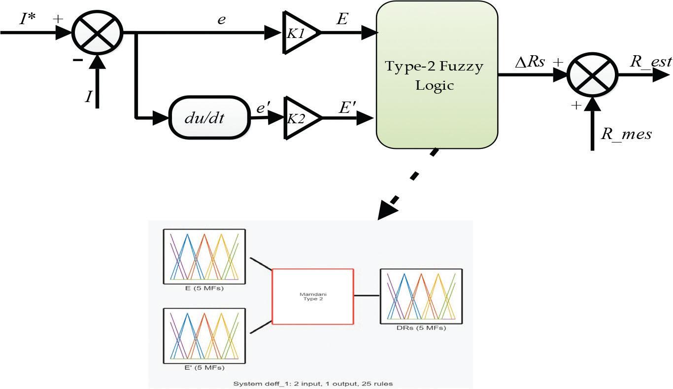 Figure 4 depicts the configuration of the type-2 fuzzy-based stator-resistance estimator (Dilmi et al., 2021).