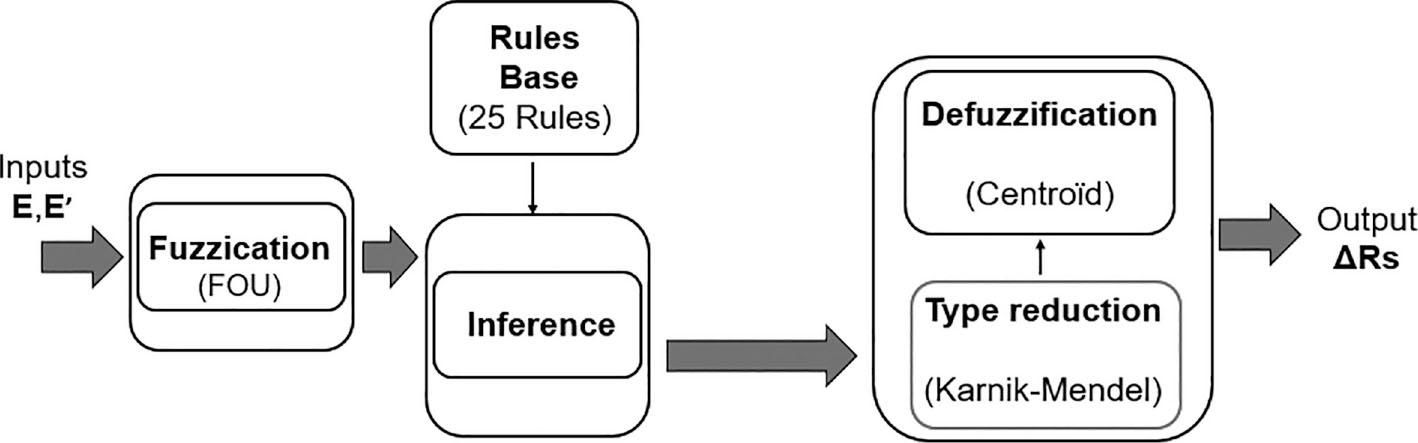 The inputs to the T2-FL system are the current error E and its derivative E′, both normalised to lie within the interval [−1, 1]. The type-2 fuzzy output is the incremental adjustment amount in stator resistance (ΔRs). The final stator resistance is then obtained through the recursive addition: