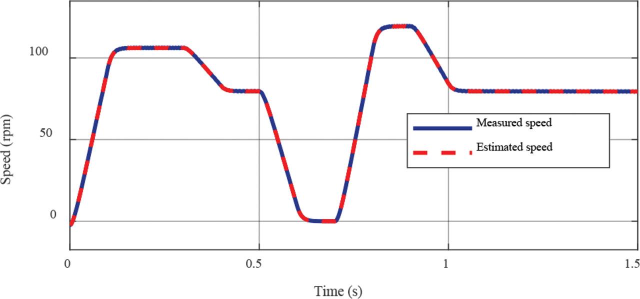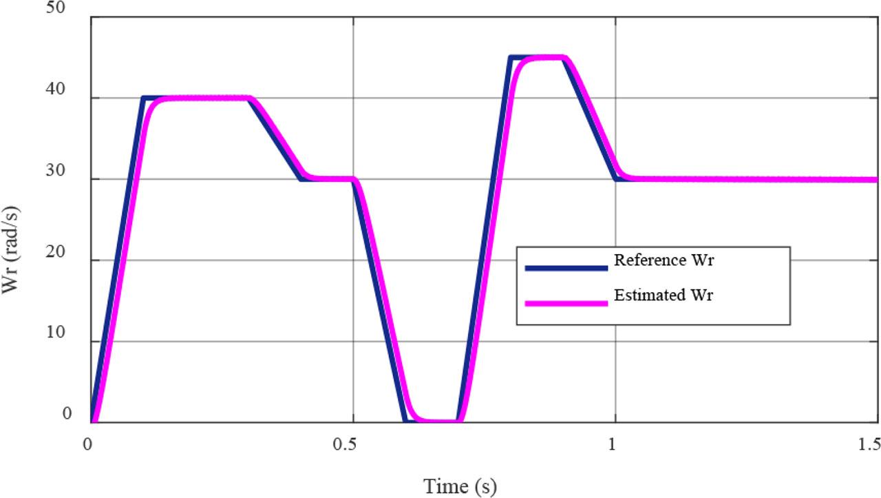 In parallel with the development of speed, Figure 8 illustrates the reference driving cycle and the estimated angular velocity of the rotor (rad/s), giving a clearer view of how the estimator performs dynamically as expected. The comparison shows differences during sudden changes in the system due to the low delays of the observer in detecting rapid speed variations.