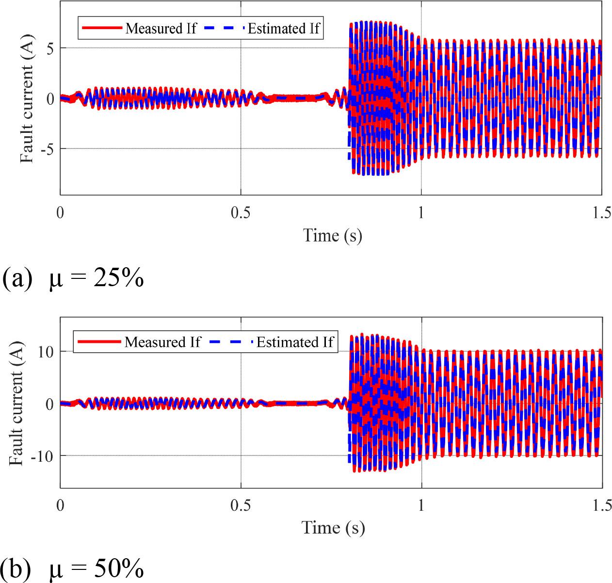 Fault current measurements. (a) μ = 25% and (b) μ = 50%.