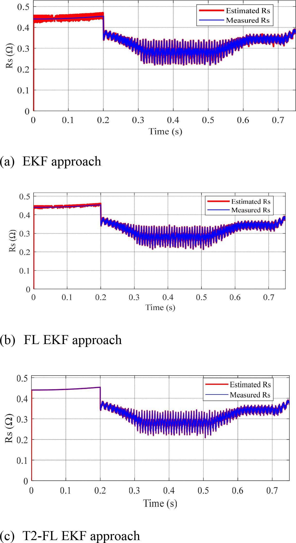 The comparison of the stator resistance Rs estimation precision of the three algorithms mentioned is presented in Figure 14. The EKF estimator observation in Figure 14a, shows large-amplitude fluctuations, although it is capable of tracking the stator resistance value. Without an intelligent compensation mechanism, the estimation remains subject to stochastic uncertainties. The integration of FL, as illustrated in Figure 14b, smooths the estimation. By acting as a smart filter, the fuzzy module absorbs some of the measurement noise. However, the fixed membership functions of Type 1 do not fully account for variable uncertainty. From Figure 14c, we conclude that the proposed approach T2-FL–EKF offers the most stable signal with a significant reduction in fluctuation amplitude. This performance is explained by the FOU, which allows the system to better tolerate inaccuracies in the EKF residuals, ensuring smooth convergence and increased accuracy in the stator resistance estimation.