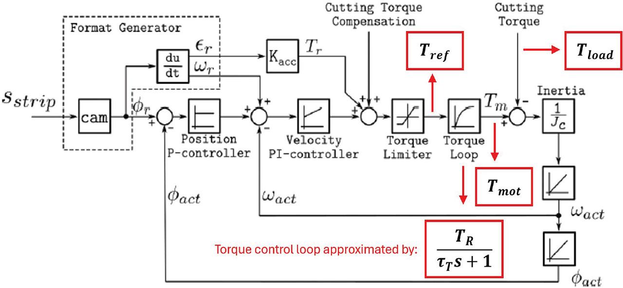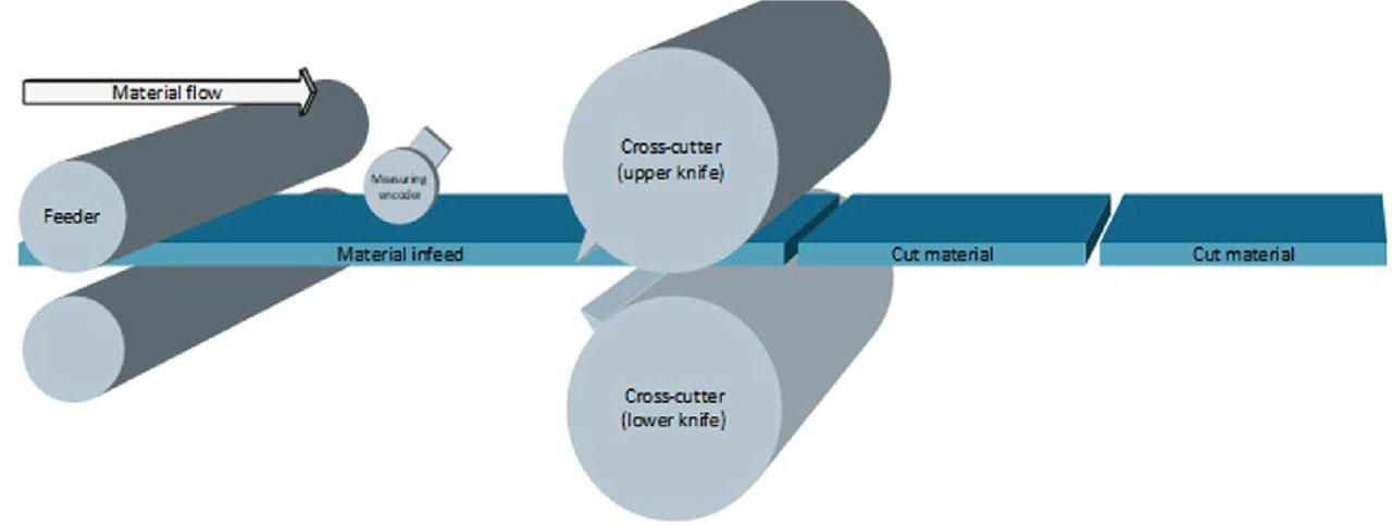 During the cutting process, a sudden increase in shear torque occurs, causing a short-term deceleration of the drive, which may lead to deviations in the cut length and to deformations of the processed material. In addition, accelerated wear of the mechanical components and cutting knives takes place. These impact-related dynamic phenomena are particularly critical at low strip speeds, where the system possesses lower kinetic energy and is therefore more susceptible to speed drops (Magura et al., 2014). A simulation model of such a system was explained in the available literature (Cinquemani and Giberti, 2015).