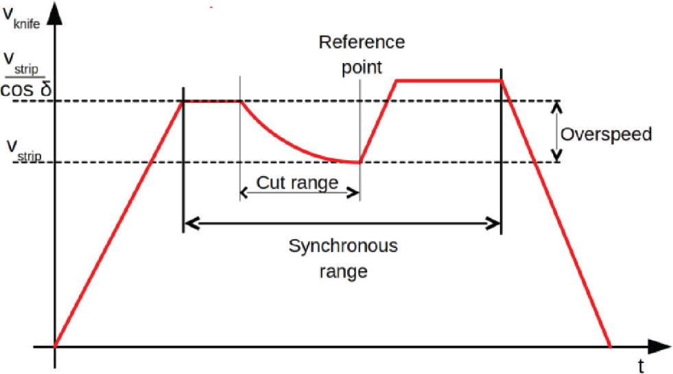 The operating cycle includes a critical region referred to as the synchronous range (SR), within which the instantaneous circumferential speed of the knives matches the strip speed. Cutting must be performed precisely within this range to minimise relative motion between the knife and the material and to prevent deformations or cut-length errors. The SR is defined by two angular limits: the start of the synchronous range (SSR) and the end of the synchronous range (ESR), which determine the permissible time window for executing the cut.