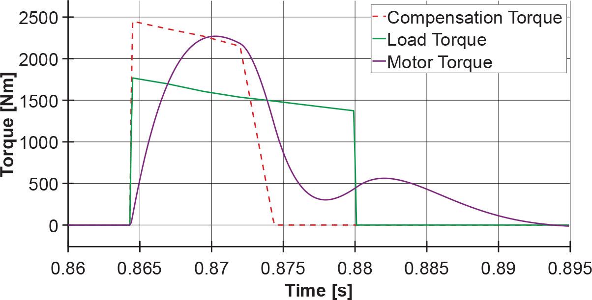 The control of drum flying shears is particularly challenging due to the short duration but high shear torque, which has an amplitude comparable to the rated motor torque and lasts only a few milliseconds. This impulse causes a significant speed drop of the shears, especially at low strip speed, where the kinetic energy of the system is insufficient to cover the cutting work. The speed drop has three major consequences:
