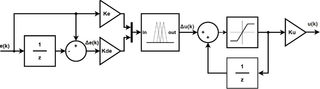 The fuzzy controller processes two input variables: the speed control error e(k) and its change Δe(k). These inputs are normalised using normalisation coefficients Ke and Kde. After normalisation, a three-stage Mamdani fuzzy logic procedure is applied: fuzzification, rule-based inference and defuzzification. The membership functions used are shown in Figure 7.